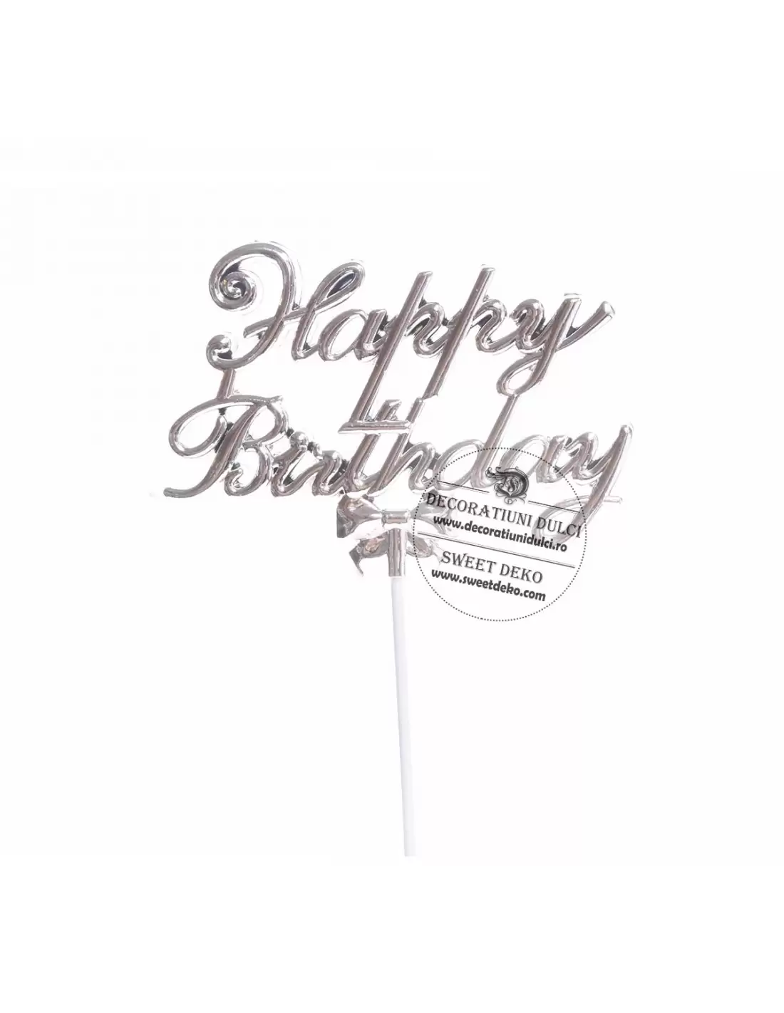 Decor necomestibil din material plastic, cu mesajul Happy Birthday, gata sa fie asezate pe deserturi.Topperul este prevazut cu o tija din plastic, care se poate scoate, in cazul in care doriti sa asezati decorul pe lateralul tortului dvs.