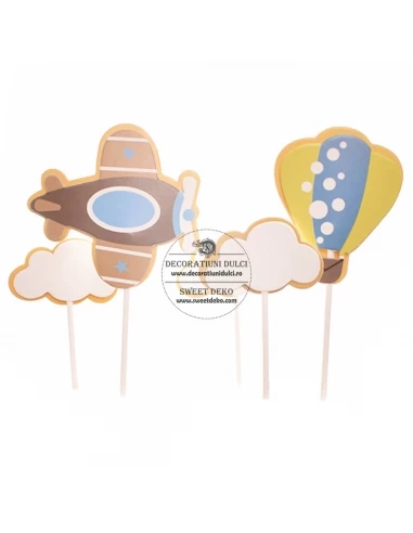 Mini topper printre nori sunt 5 decoratiuni din carton pentru tort, briose etc. Un set format din 3 norisori, un avion si un balon cu aer cald, gata pregatite sa decoreze deserturile celor mai mici aviatori.