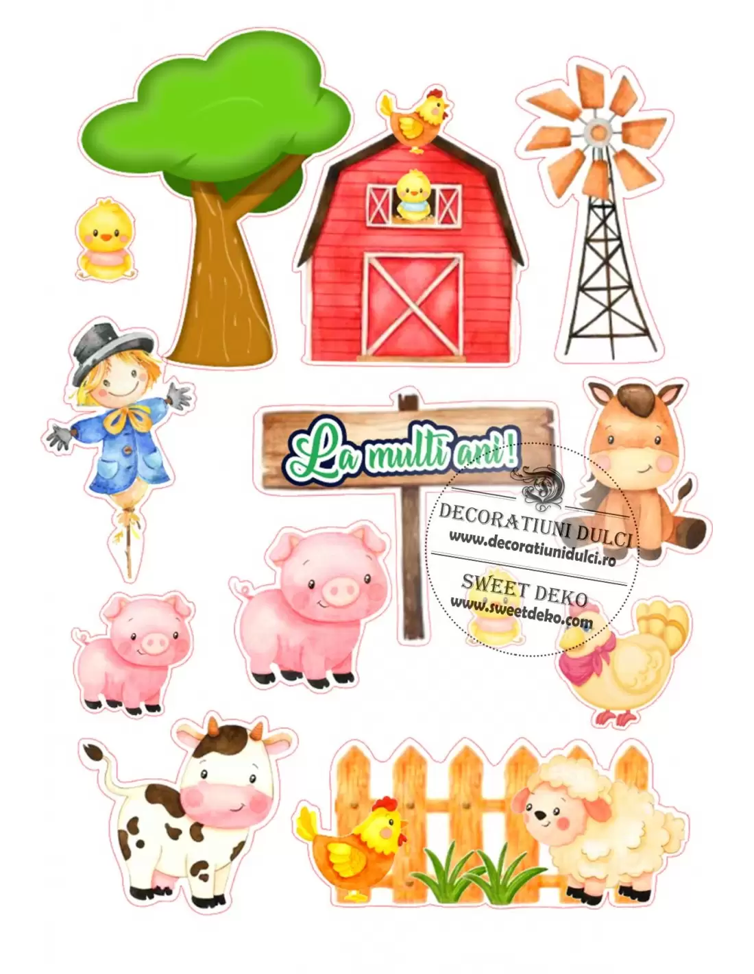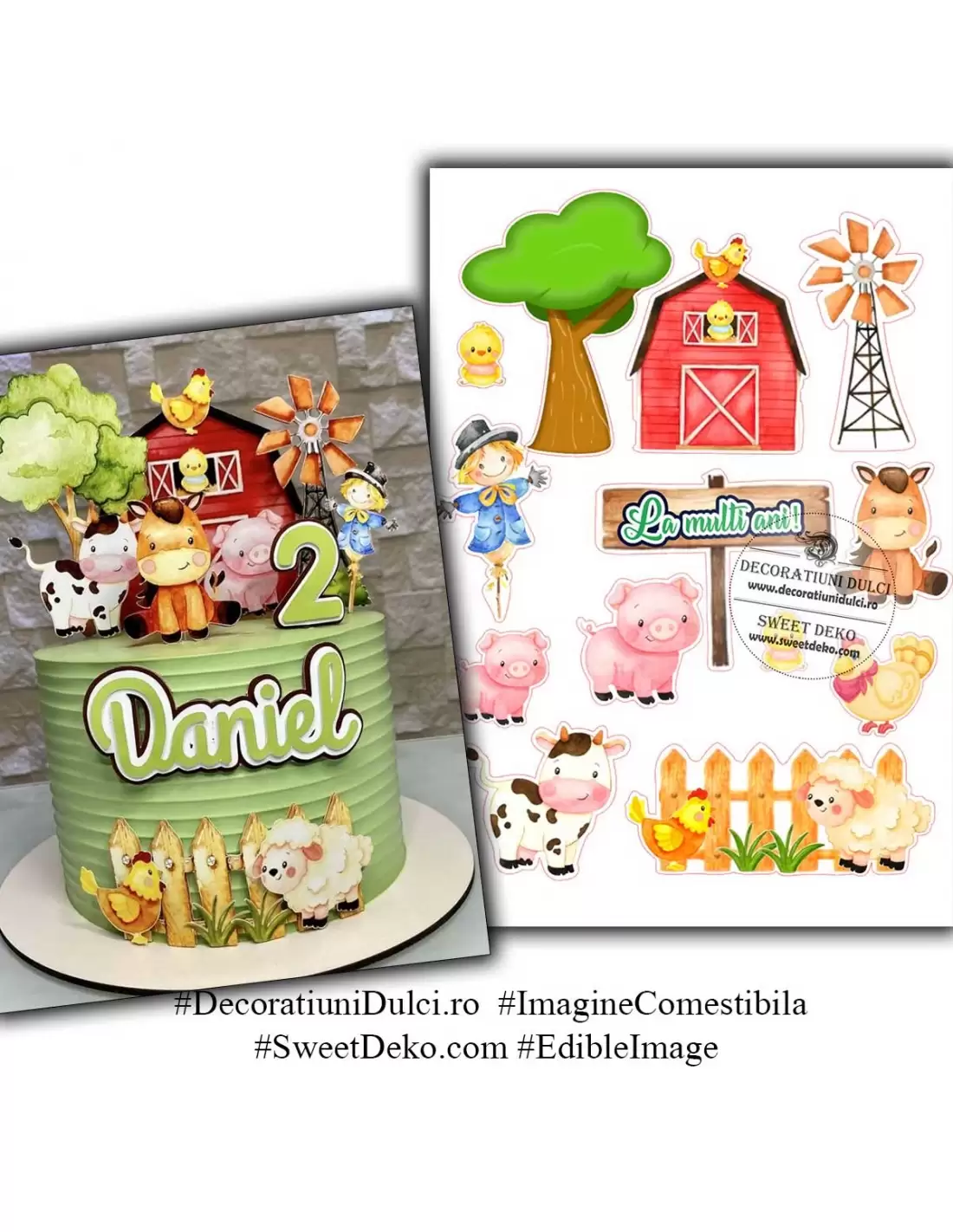 O coala imprimate cu diferite imagini pentru a decora un tort cu tematica animale domestice.