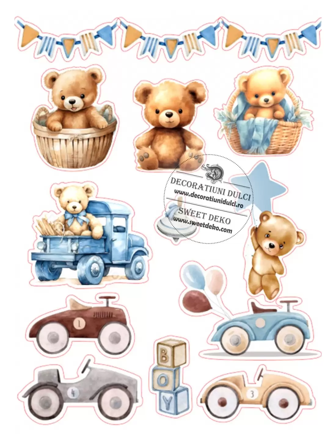 Ursuleti de plus si masinute asortate pentru a decora cele mai dulci deserturi care serbeaza bebelusii. Un decor dragut pentru tortulete de baietei.