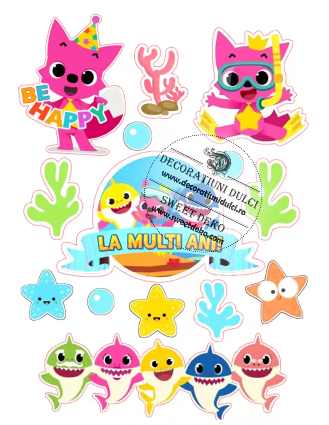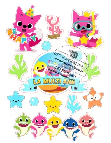 eticheta cu "La multi ani!" 14cm x 9cm, vulpita roz 8cm si 10cm inaltime, 6cm bordurica Baby Shark, stelute de mare 3.5cm - 4cm