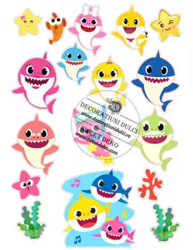 Imagine comestibila cu personajele din desenul animat Baby Shark. Adaugati cateva elemente tridimensionale macarons, foi de orez, vafa decorativa si decorul va fi unul uimitor.