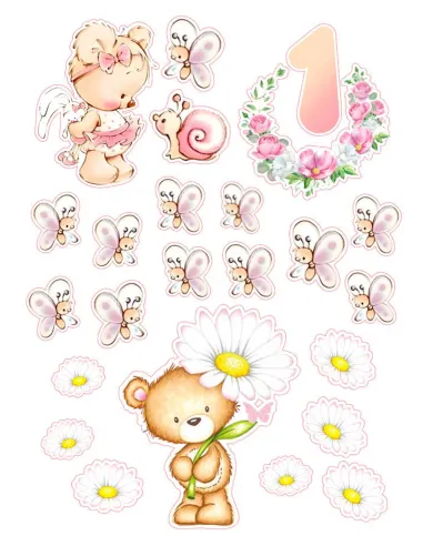 Ursulet roz 9cm, ursulet cu margareta 12cm, cifra 6cm, fluturasi max. 3.5cm