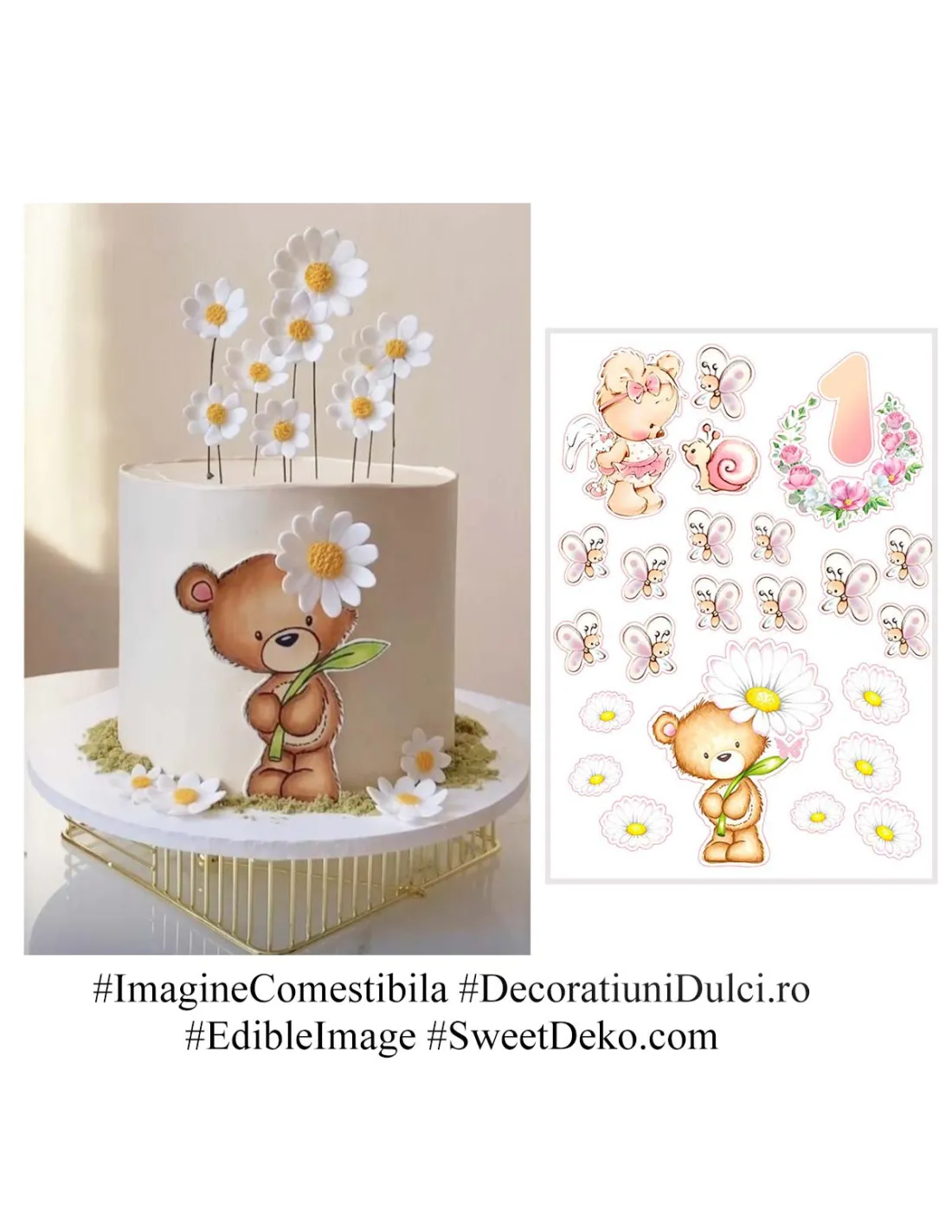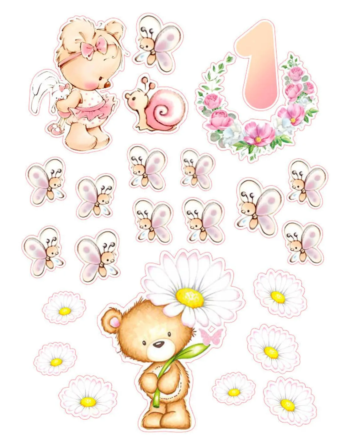 Imaginea comestibila „Ursuleti, fluturi roz si margarete” aduce un aer delicat si vesel oricarui tort de fetita.