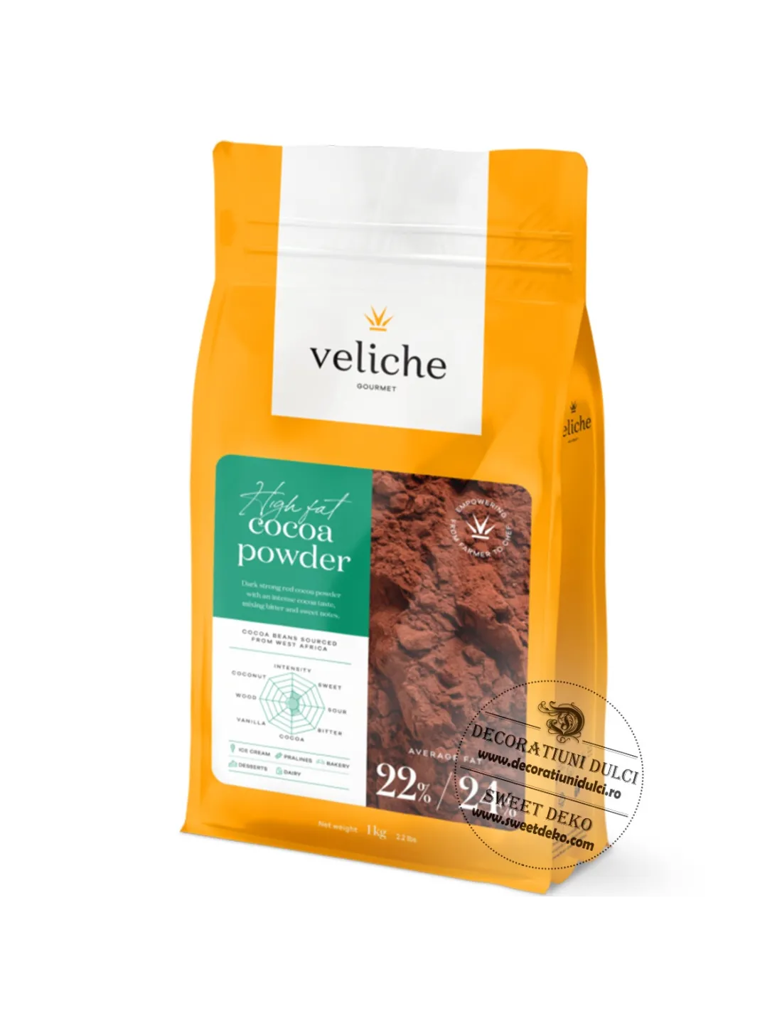 Pudra de cacao 22-24% este un ingredient obtinut din boabe pure de cacao, prajite, zdrobite si presate printr-o metoda olandeza. Cacao VELICHE este bogata in grasimi si are o aroma profunda de cacao, se potriveste pentru a adauga un gust intens si autentic produselor de cofetariue, patiserie, gelaterie etc.