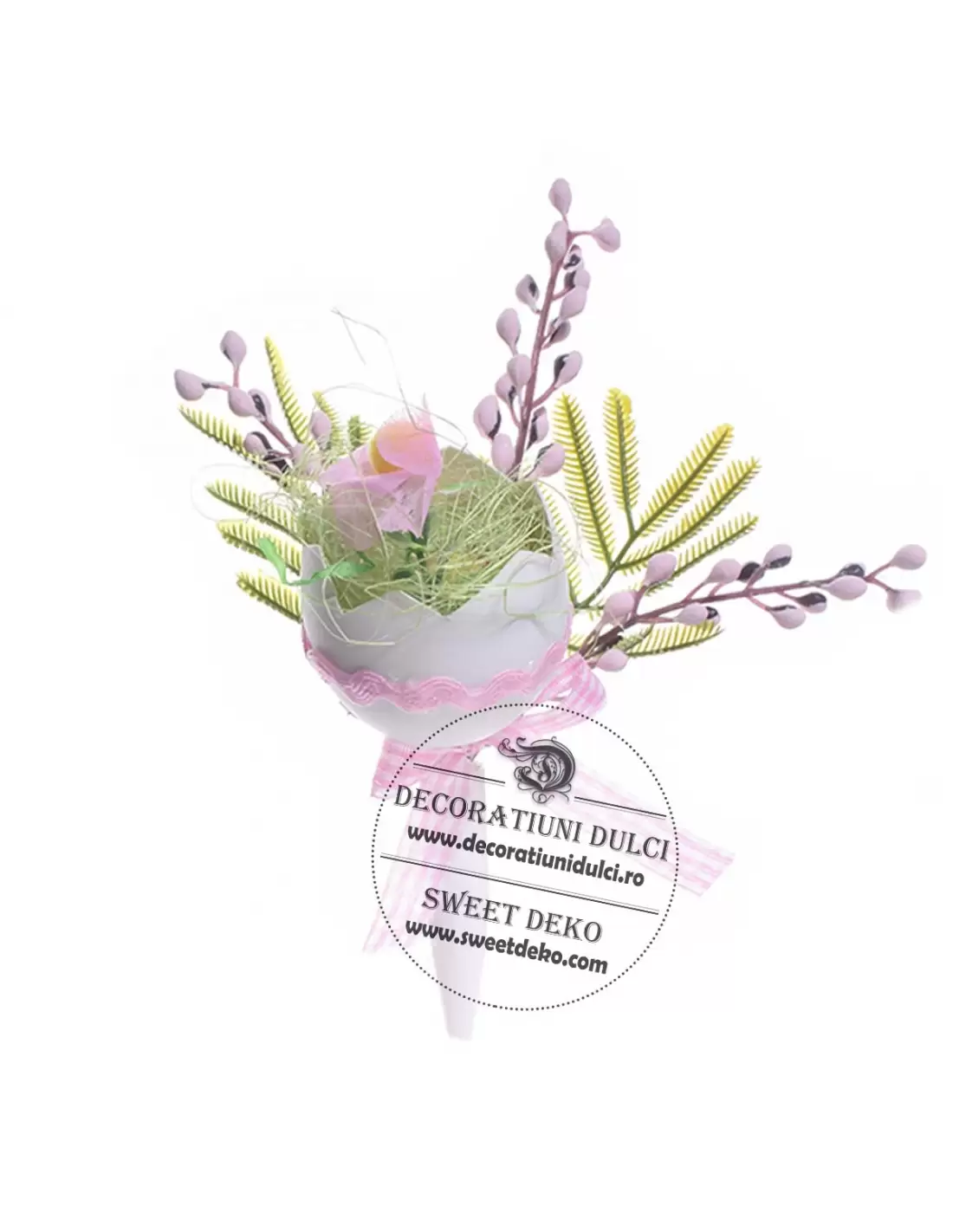 Decorul transpune o coaja de ou in interiorul careia se afla o floare roz. Buchetelul este completat cu ramurici cu bobite roz, asemeni matasorilor care vestesc primavara.