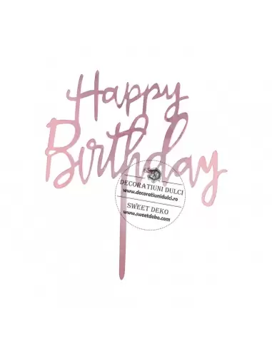 Topper Happy Birthday din material acril roz pentru decorarea torturilor.