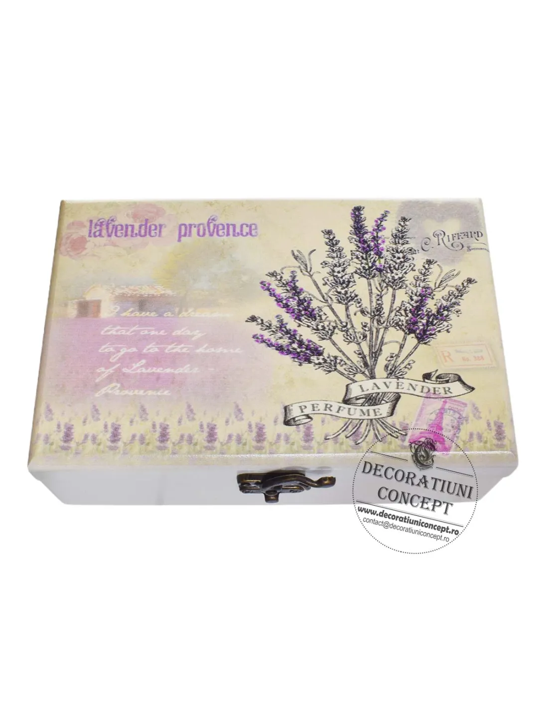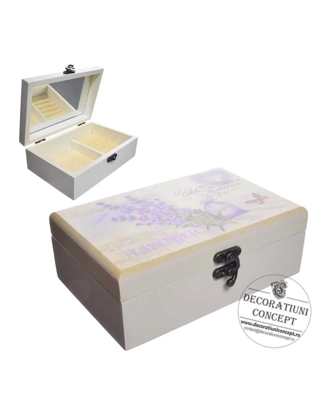 Caseta de bijuterii, din lemn, de culoare crem iar in partea superioara este decorata cu ilustratii placute: un buchetel de lavanda.