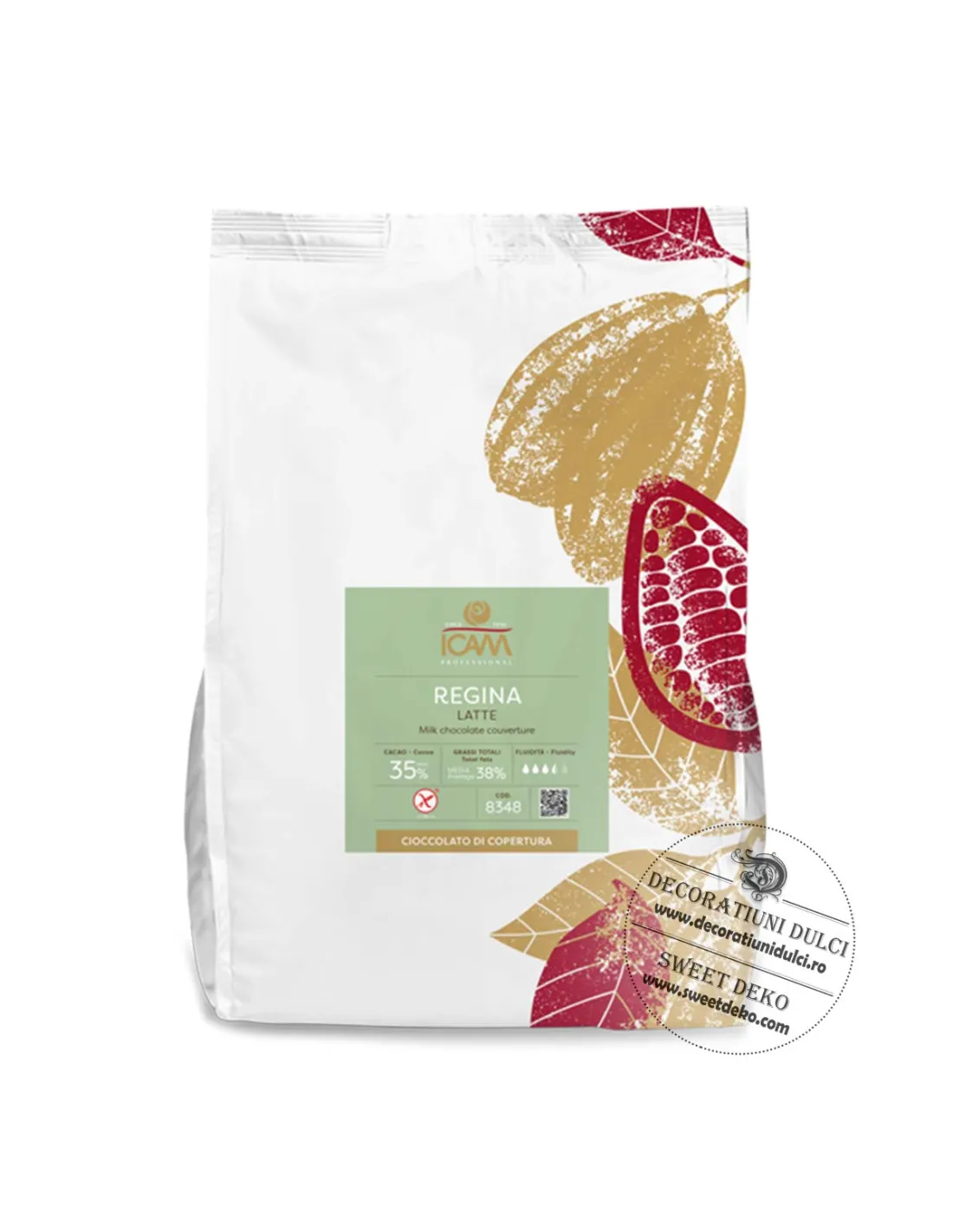 Ciocolata cu lapte Regina 35% este o couverture profesionala de inalta calitate, rezultatul a peste 70 de ani de expertiza ICAM in combinarea retetelor traditionale cu tehnologie moderna de productie. Are un profil aromatic echilibrat si o textura fluida, ideala pentru utilizare in cofetarie, ciocolaterie si gastronomie profesionala.
