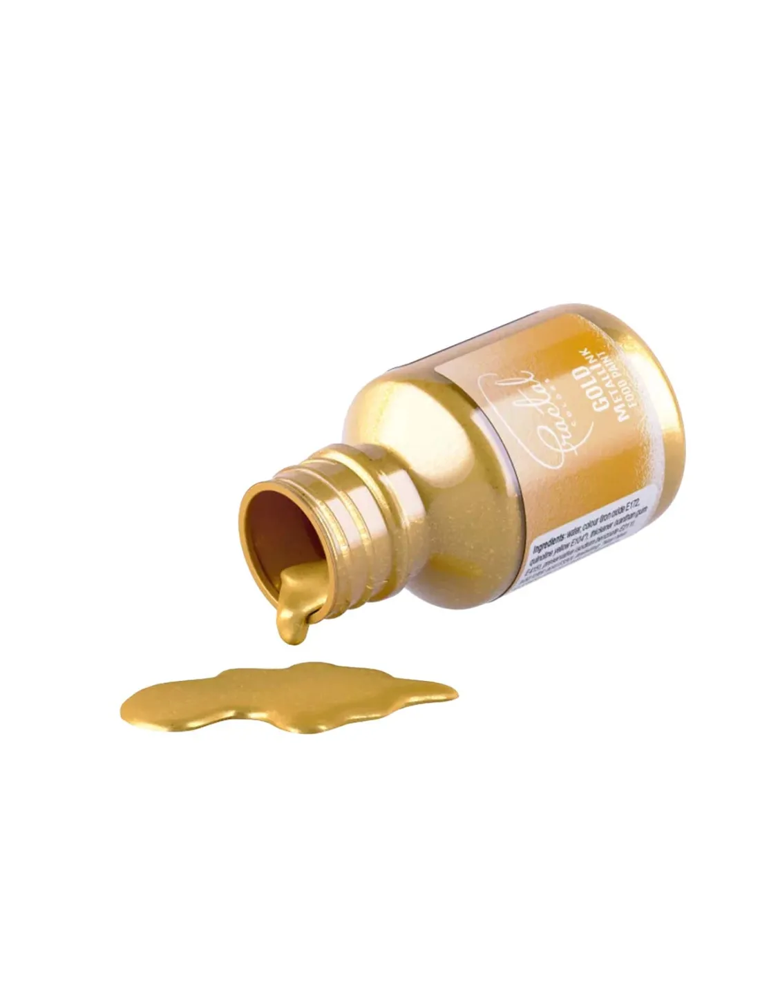 Colorant alimentar auriu lichid | Metallik Food Paint Gold este o vopsea alimentara metalizata, gata de utilizare, conceputa pentru a oferi deserturilor un efect metalic intens si elegant. Formula este deja diluata, astfel incat poate fi aplicata direct din recipient, fara pregatiri suplimentare.