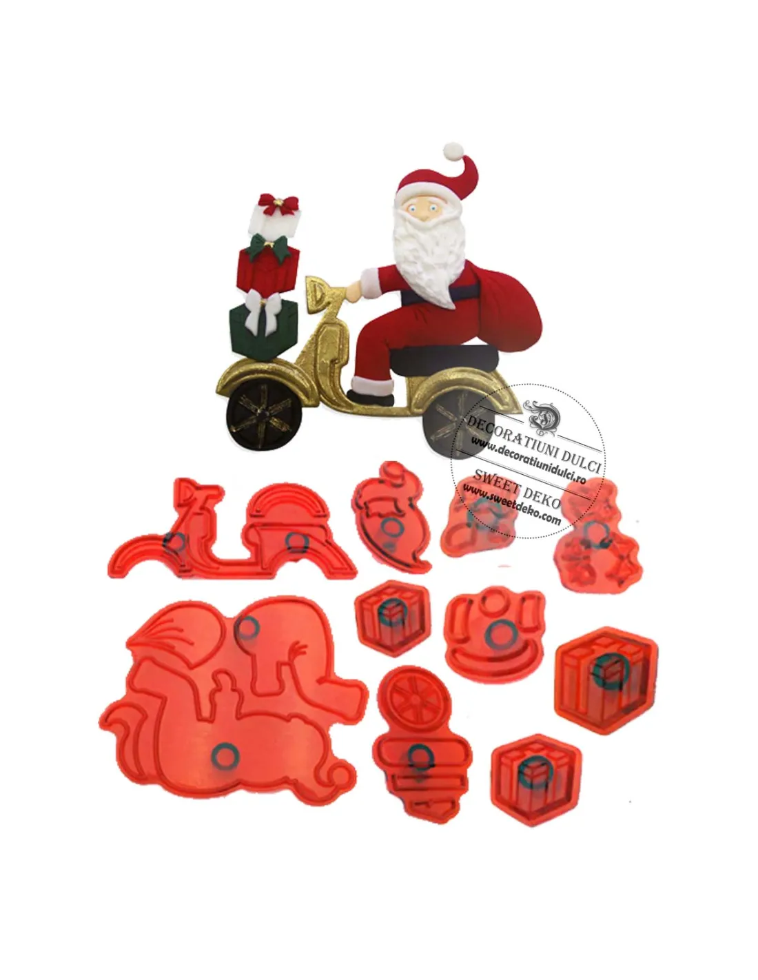 Setul contine 10 piese din plastic, cu care se obtine imaginea lui Mos Craciun pe scuter. Astfe se poate obtine un model rapid bidimensional detaliat, pasta se intinde subtire si se preseaza cu fiecare piesa.