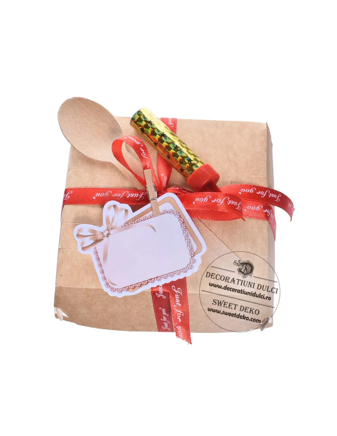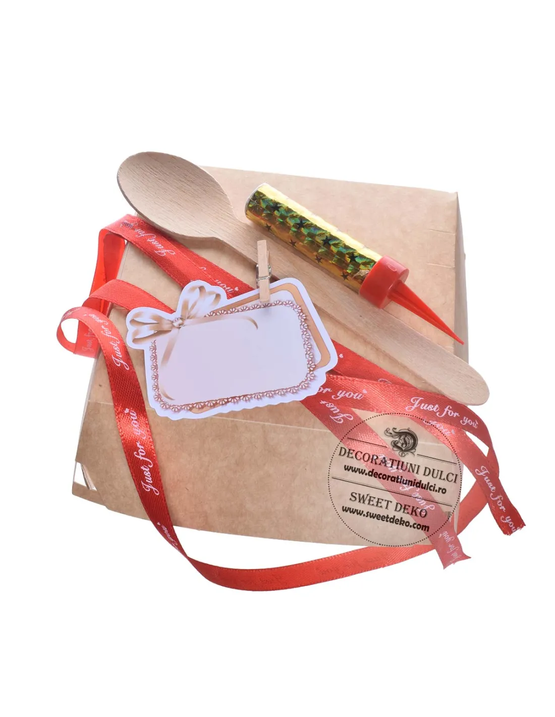 Setul contine: cutia, miniartificie, banda saten, lingura, clestisor din lemn si o mini felicitare pentru mesaje personalizate.