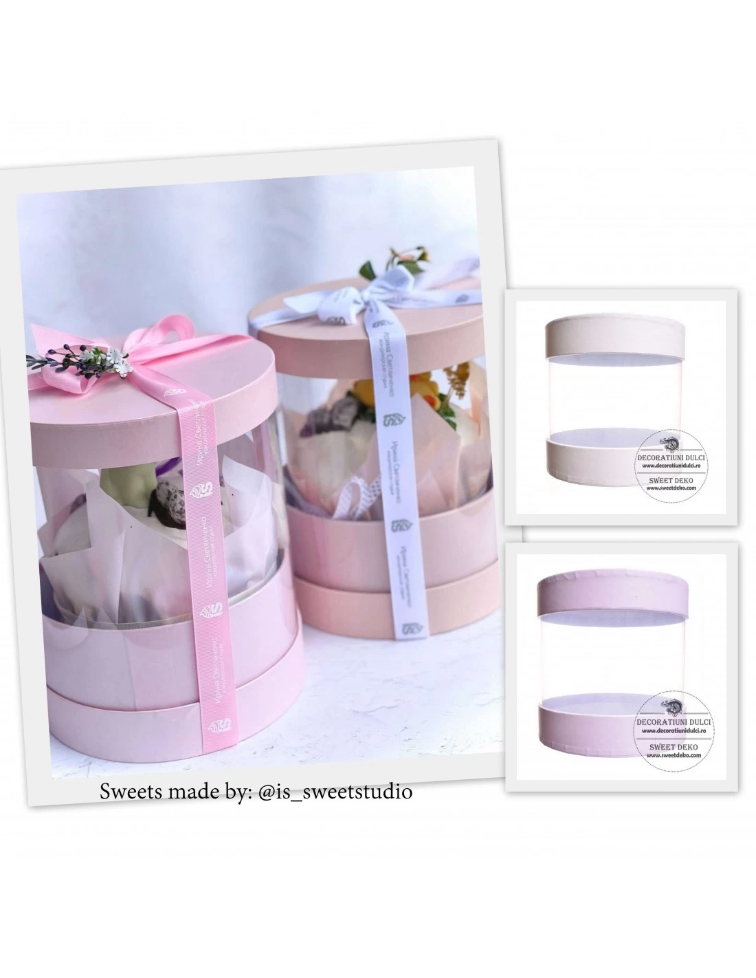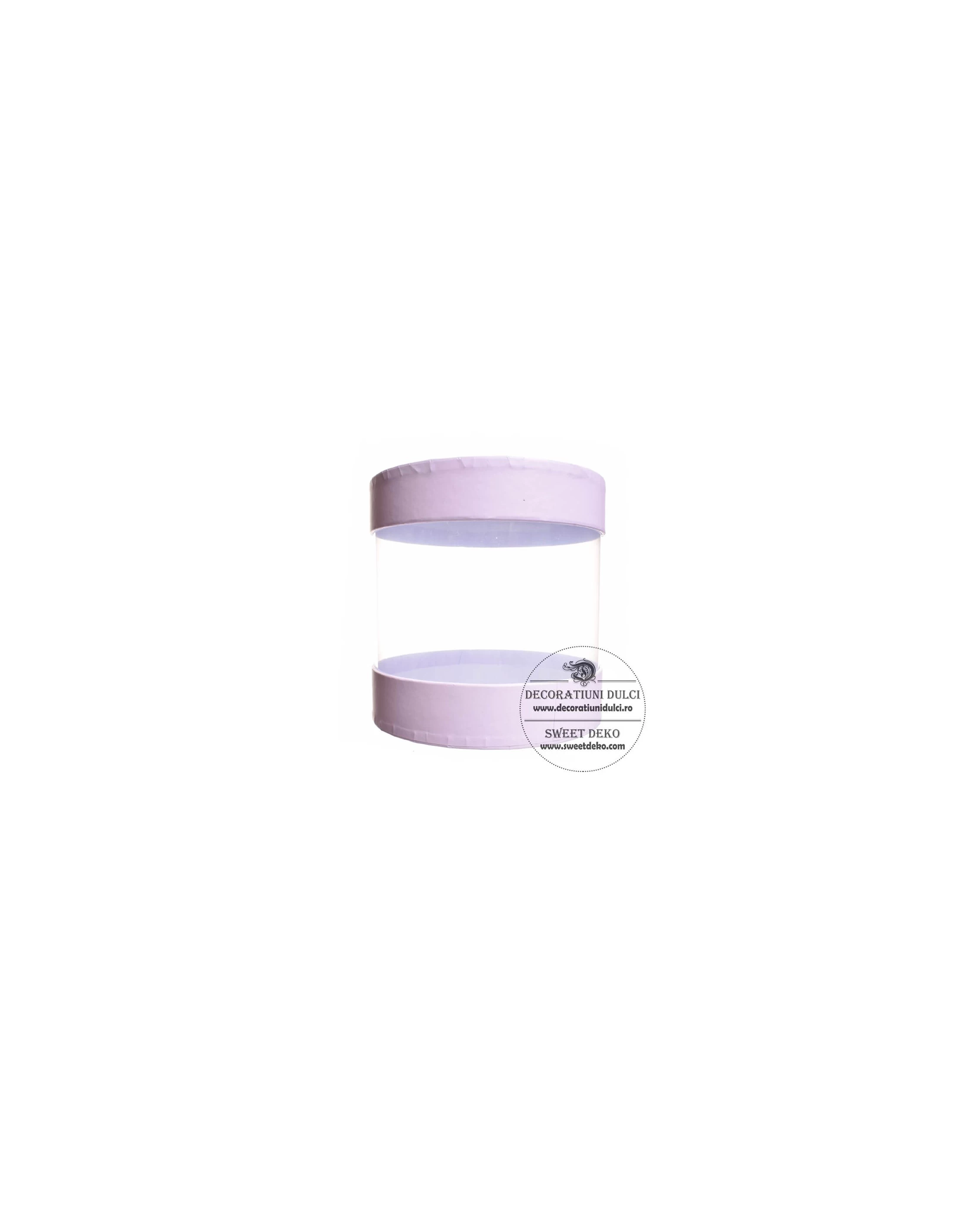 Cutie rotunda lila diametrul 13cm, cu lateral transparent este o cutiuta medie, potrivita pentru mici prajiturele: macarons, bezele, bomboane etc, a se oferi in dar.