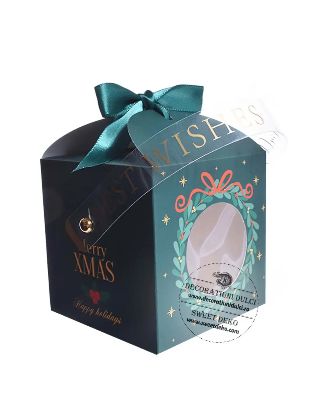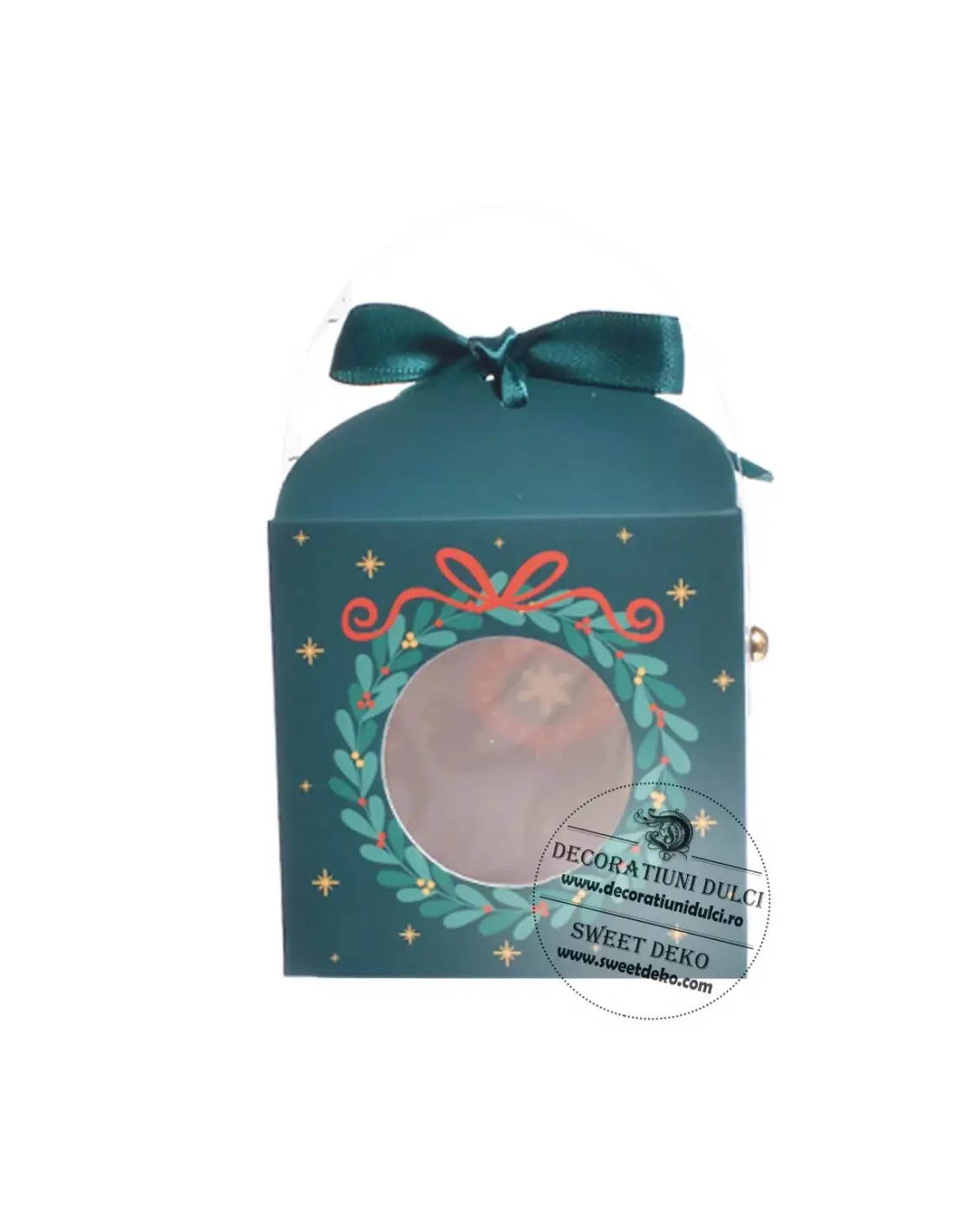 Cutiuta din carton verde cu model Craciun si fereastra potrivita pentru surprize hand made.