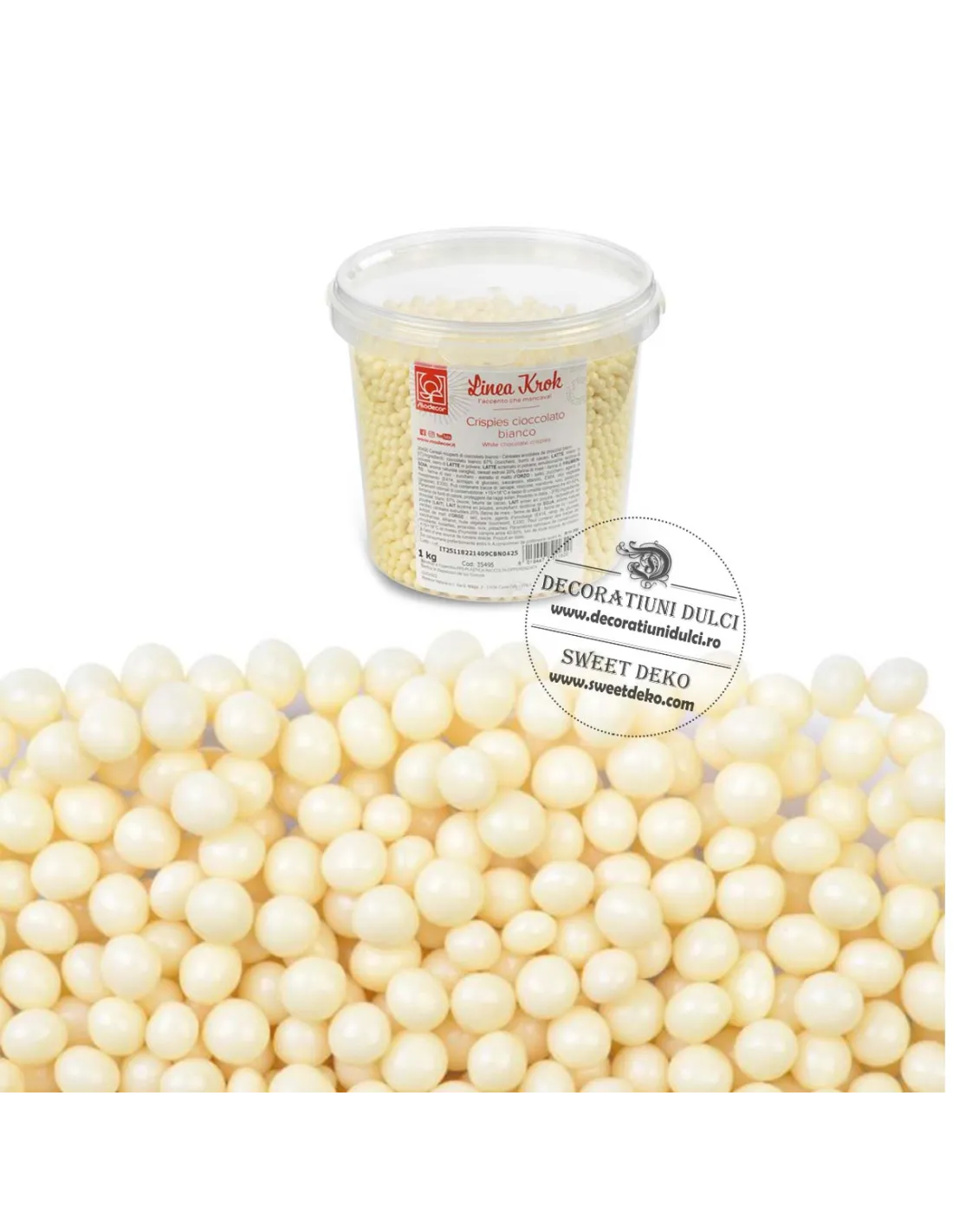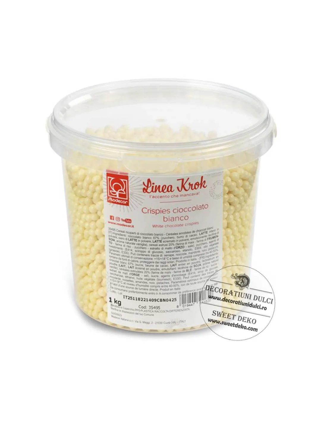 Crispies din cereale crocante invelite in ciocolata alba fina – un ingredient rafinat pentru decorarea deserturilor, prajiturilor si produselor de cofetarie. Gustul intens de ciocolata alba se combina perfect cu textura crocanta a cerealelor, oferind un contrast placut intre cremos si crocant.