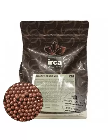 Crunchy beads cu lapte Irca, perlute de orez acoperite cu ciocolata veritabila. Au un diametrul de 2-3 mm