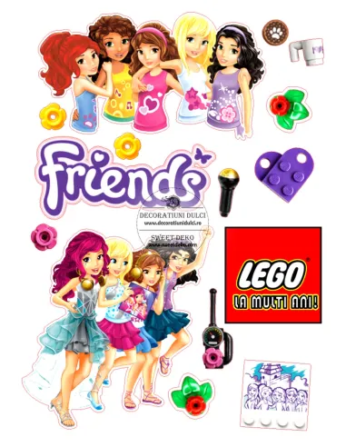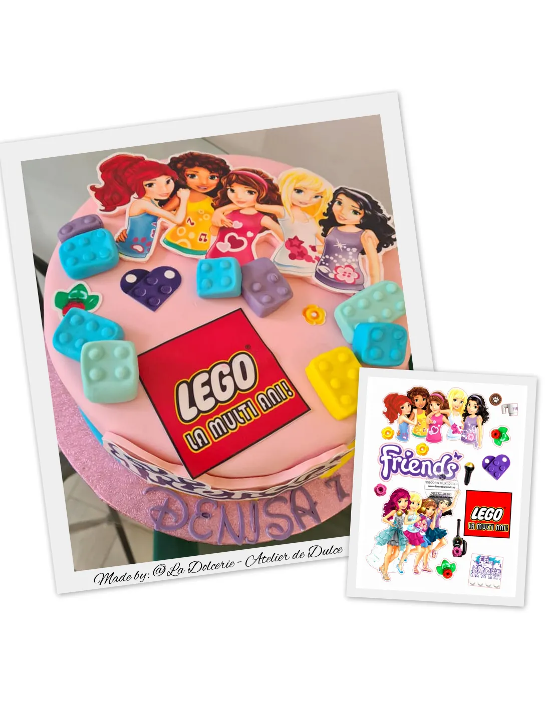 Inspirati de frumusetea prieteniei am realizat acest colaj cu imagini din Lego Friends. Pozele pot fi asezate pe orice material de acoperit: fondant, martipan, frisca vegetala, crema de unt. Pentru cele mai bune rezultate dubleaza coala de icing cu un start de pasta de zahar sau ciocolata topita (temperata daca este veritabila, sau compund).