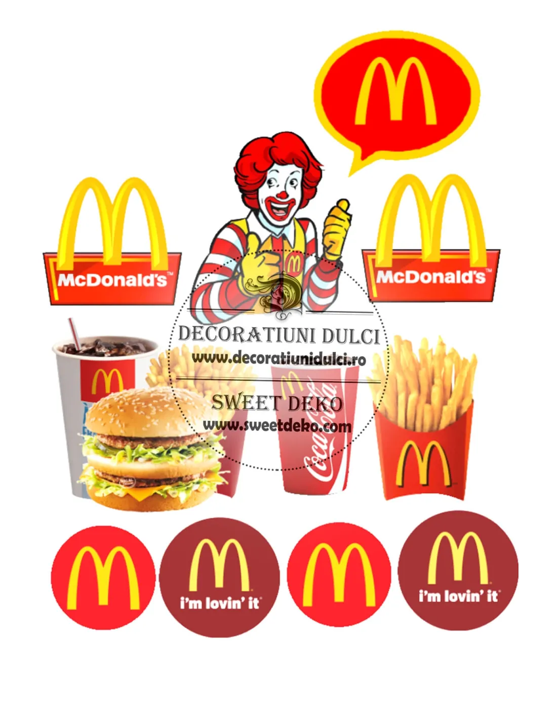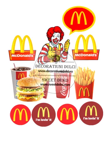 Imagine imprimata pe coala din pasta de zahar, cu poze asortate pentru un decor inspirat de McDonald's. Meniul este cu atat mai uimitor daca este ... dulce.