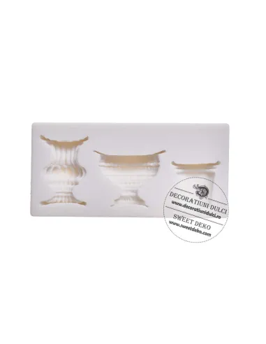 Mulaj din silicon alimentar cu 3 modele vaze. Matrita usor de utilizat pentru pasta de zahar, ciocolata, martipan sau lut polimeric.