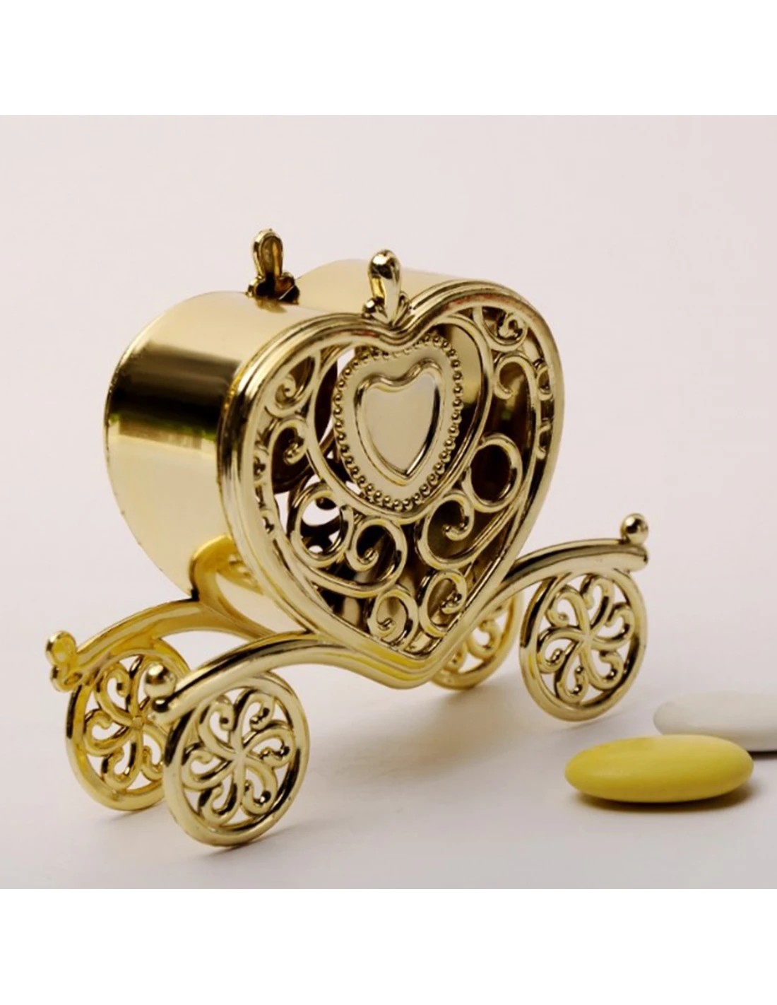 Cutie caleasca inima baroque aurie cu capac, caseta cu dimensiunea de 10*8*3 cm, formata din baza si capac ce se capsuleaza, cuprinzand in interiorul ei mici fotografii, articole decorative cum ar fi: flori, confetti sau mesaje.