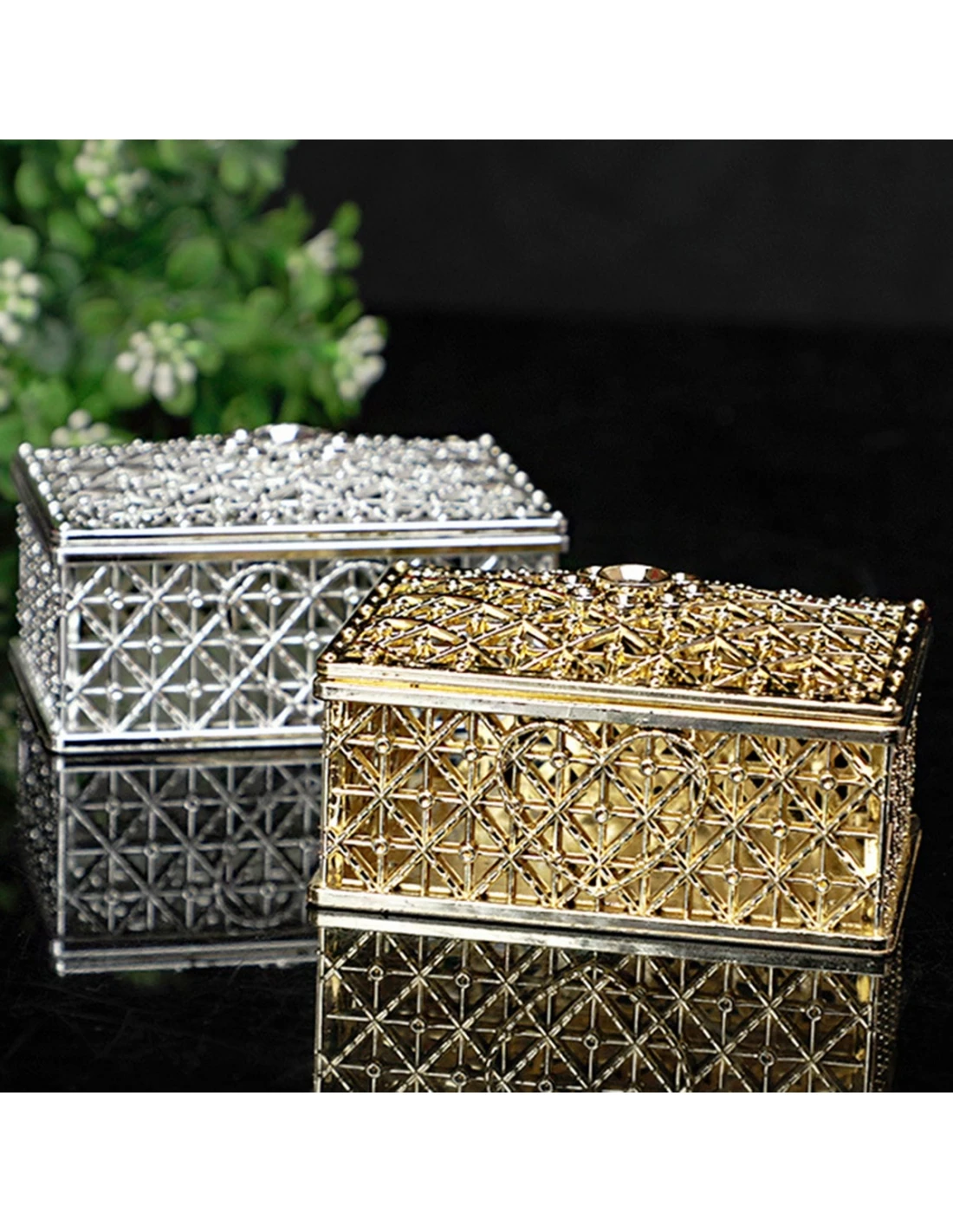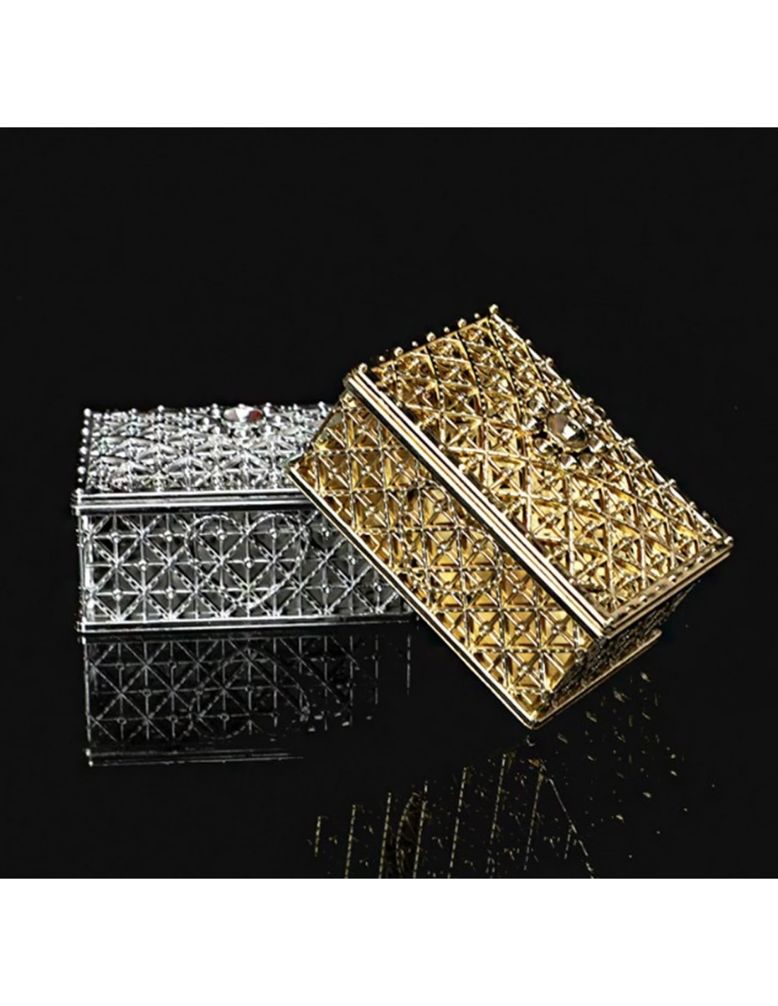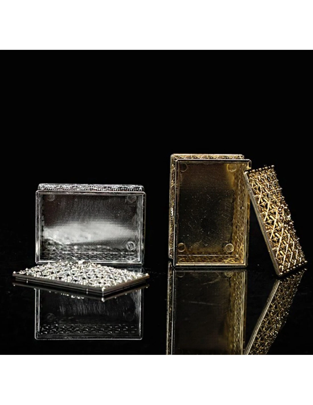 Cutie dreptunghiulara baroque aurie cu capac, caseta cu dimensiunea de 8*5*3.5 cm, formata din baza si capac ce se capsuleaza, cuprinzand in interiorul ei mici fotografii, articole decorative cum ar fi: flori, confetti sau mesaje.