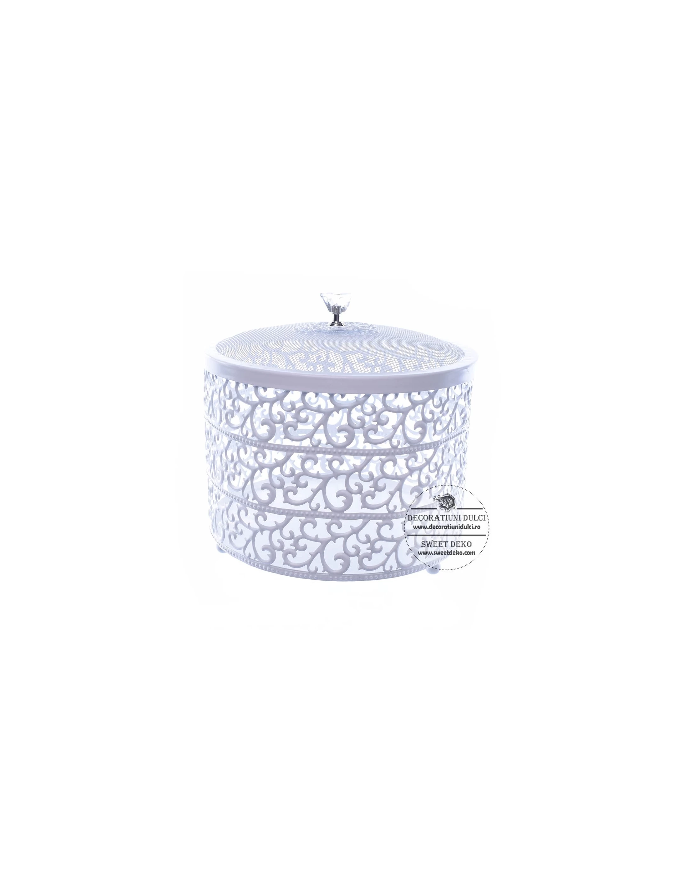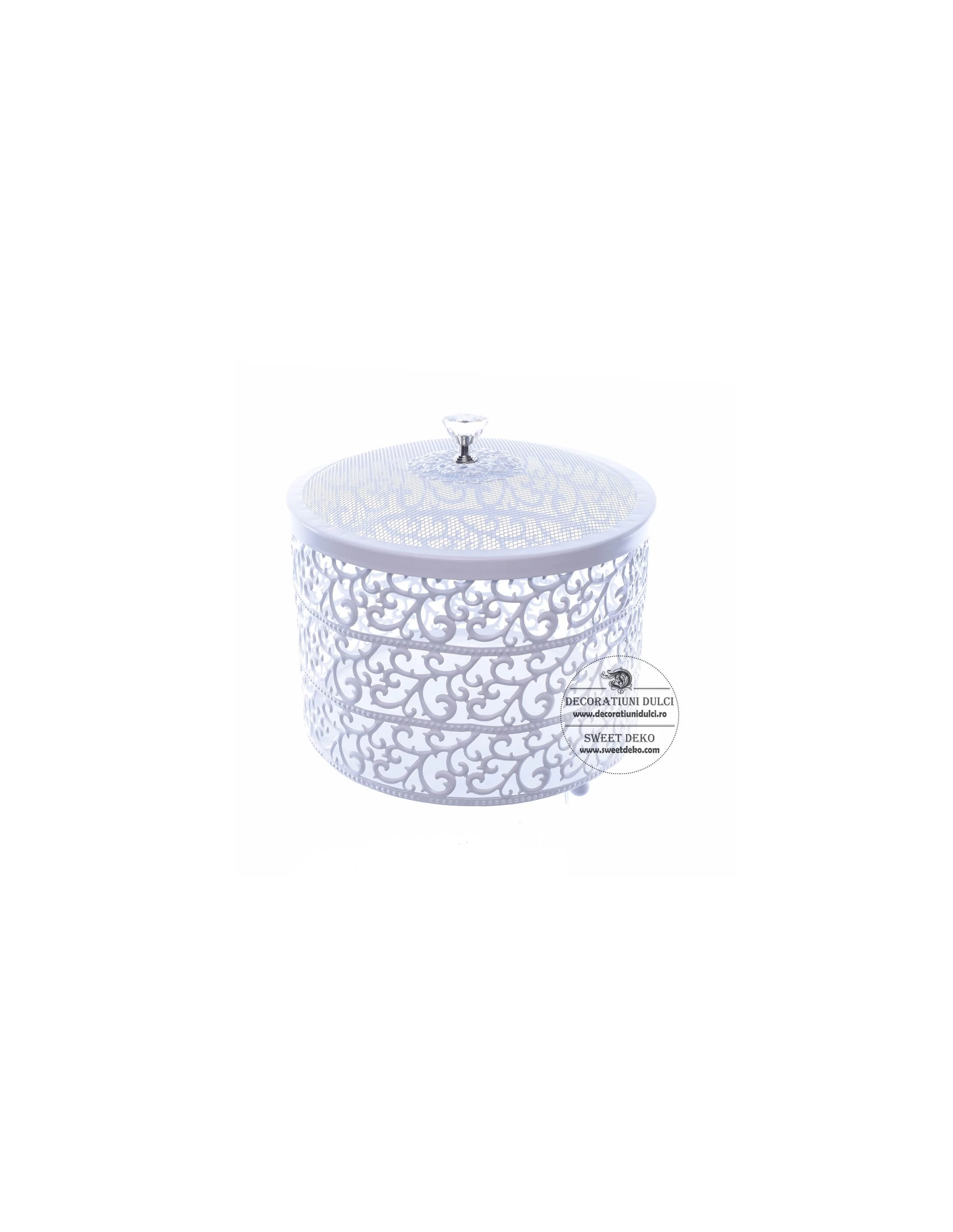 O frumoasa cutie cu broderie dantelata, din metal, vopsita in culoare alba si un maner din plastic cristal.