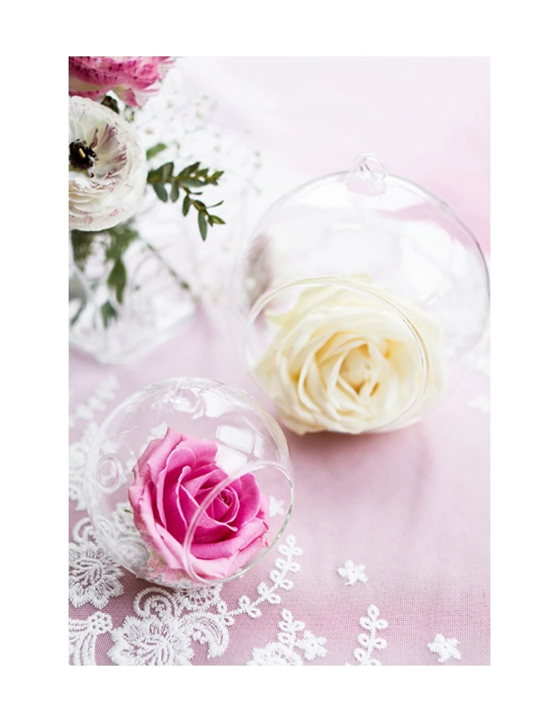 Glob acrilic terarium transparent cu diametrul de 8 cm, format din 2 semi-sfere transparente ce se capsuleaza, cuprinzand in interiorul lor mici marturii, fotografii, articole decorative si aranjamente florale. Globul terarium are orificiul in partea frontala.