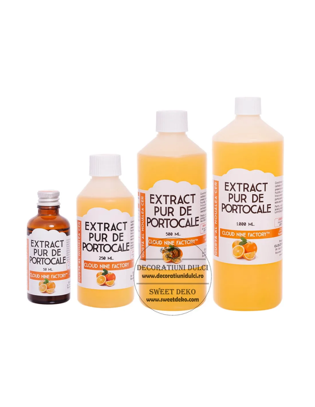 Pentru obtinerea extractului de portocale sunt utilizate doar uleiuri pure presate la rece și certificate la standard Food Grade, s-a decit folosirea doar a uleiurilor pure certificate organic cu o aromă mai intensă decat cele standard.