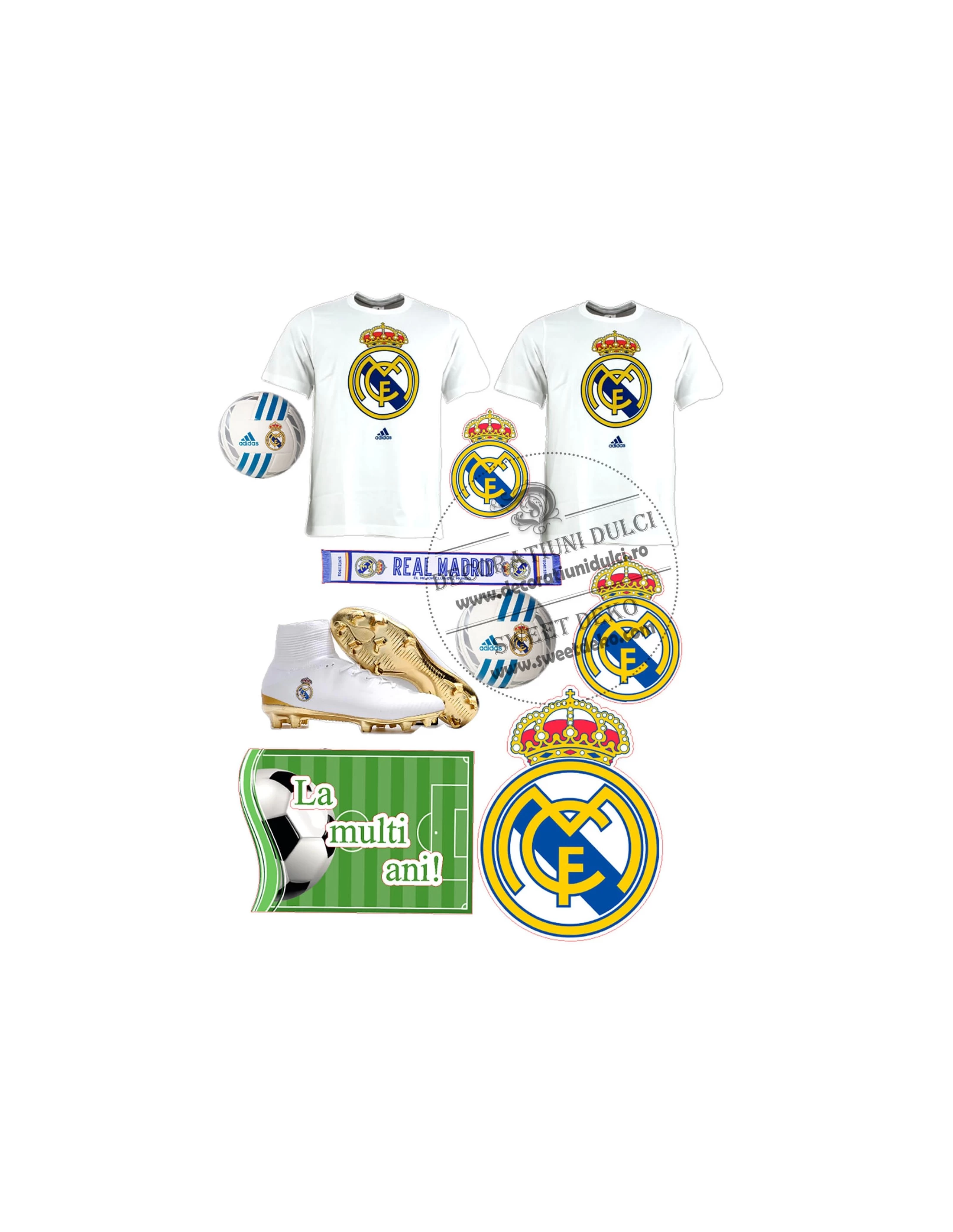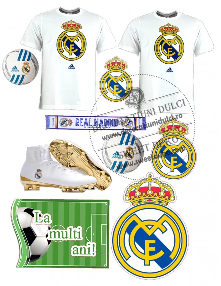 Imagine comestibila REAL MADRID, contine mai multe poze, pentru decorarea torturilor. Pozele se pot lipi dupa preferinta, atat pe centrul tortului cat si pe lateral. Pentru a le fixa in picioare, coala se dubleaza cu un start de pasta de zahar si se lasa la intarit.