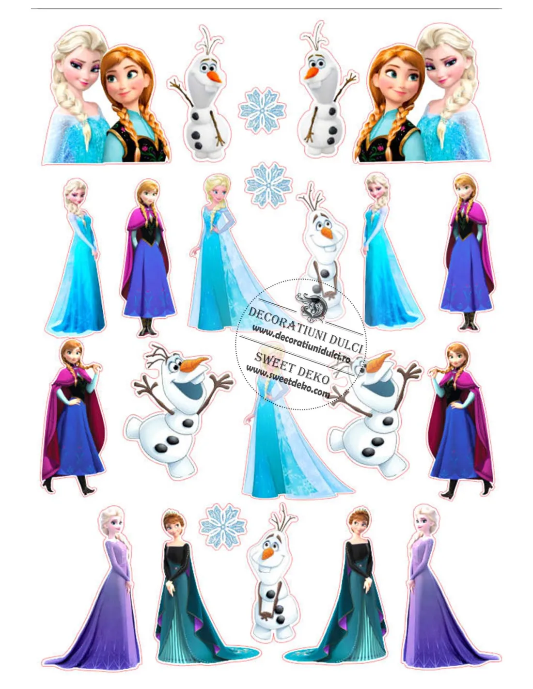 Imagine comestibila cu care se pot decora tortulete mai mici sau briose cu Elsa, Ana si Olaf in diferite ipostaze.