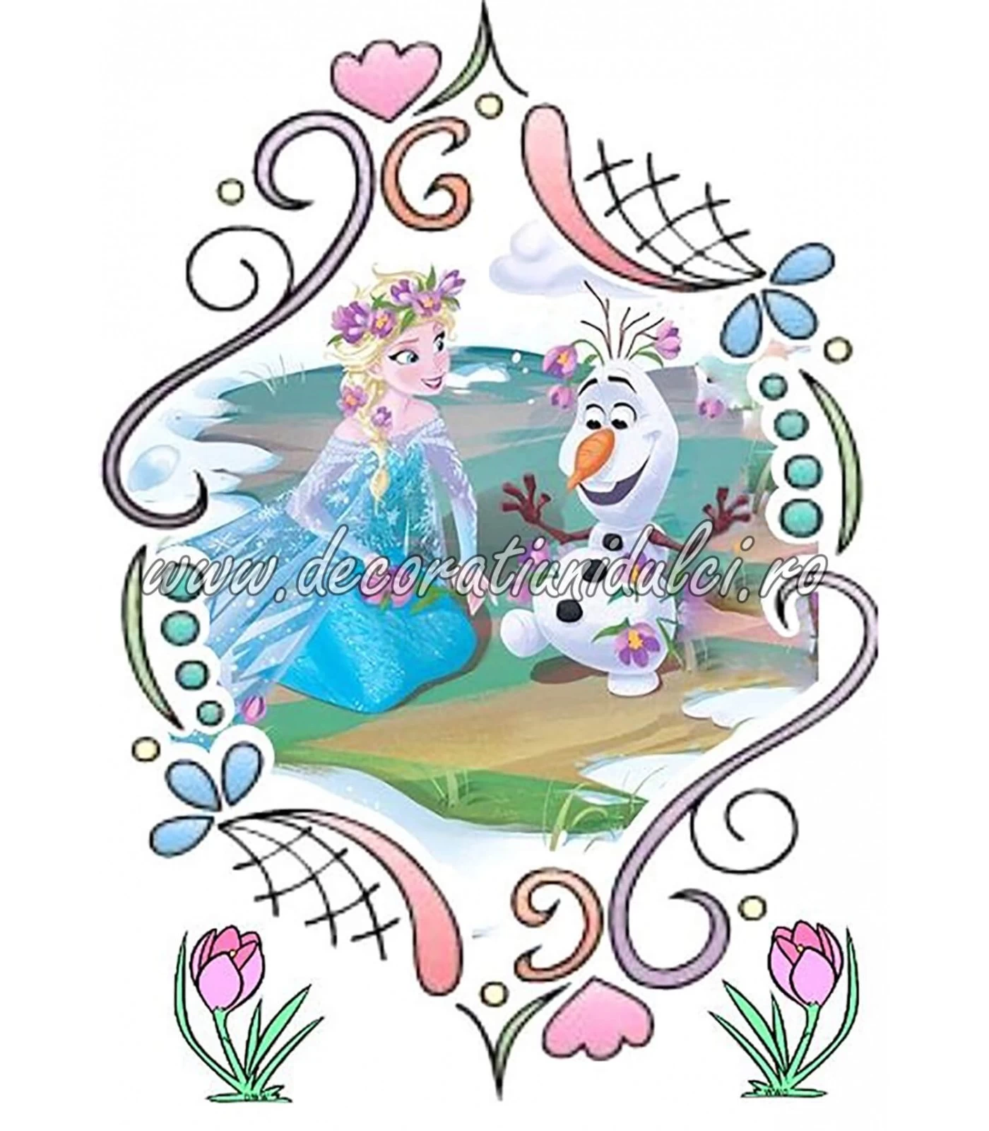 Primavara cu Olaf si Elsa, aranjate pe o coala A4 intr-o rama asortata. O imagine imprimata pe coala din pasta de zahar. Se recomanda asezarea colii pe torturile acoperite cu icing/martipan, ciocolata modelabila. Se umezeste foarte putin suprafata pe care se aplica si dupa fixarea colii nu se aplica gel neutru. Culorile sunt intense si vibrante si se recomanda ca torturile ornate astfel sa nu fie congelate. Daca se doreste pastrarea tortului mai mult de 24 de ore pana la servire se poate aplica un luciu alimentar (lac/spray alimentar) care va proteja coala de umiditatea din mediu.