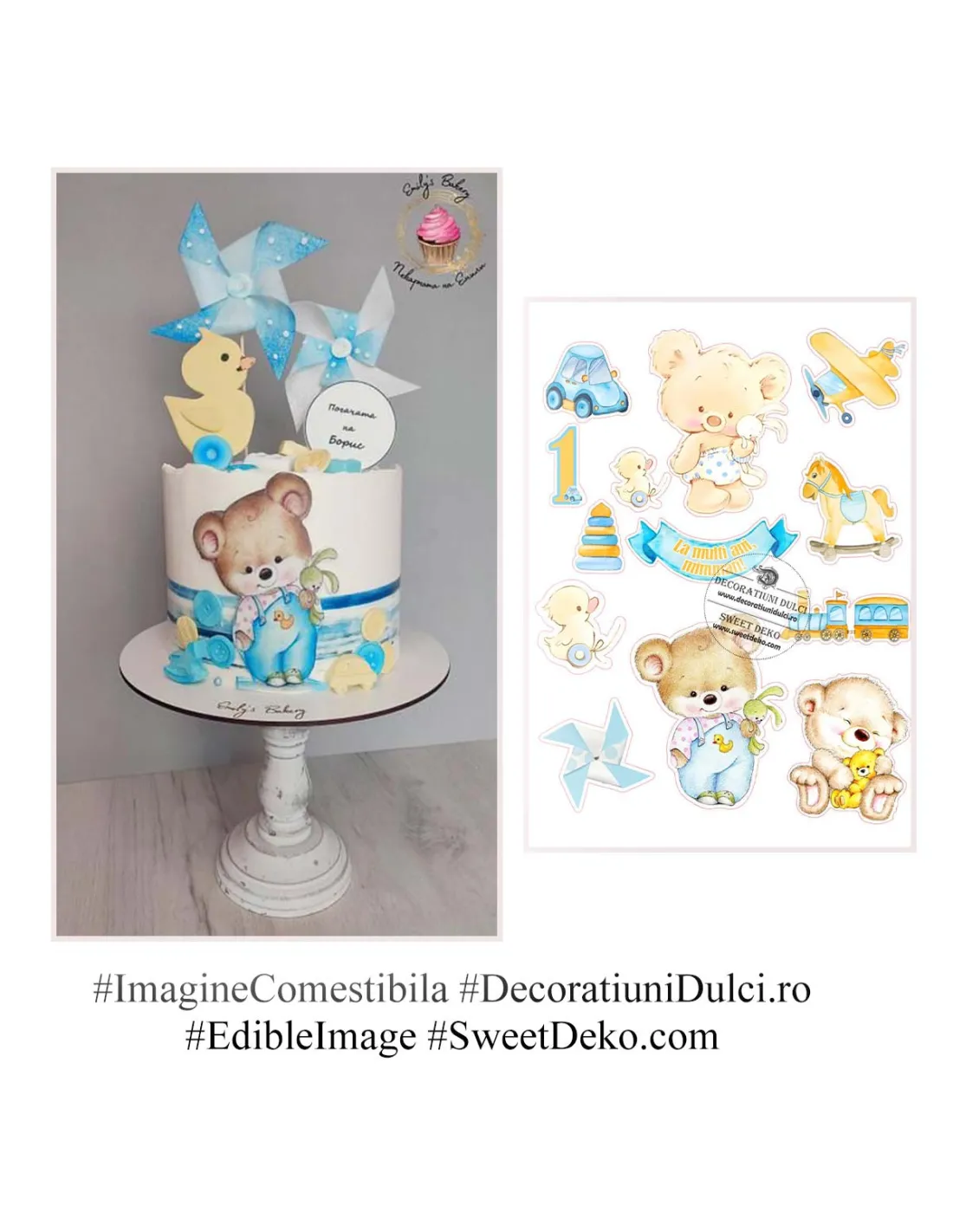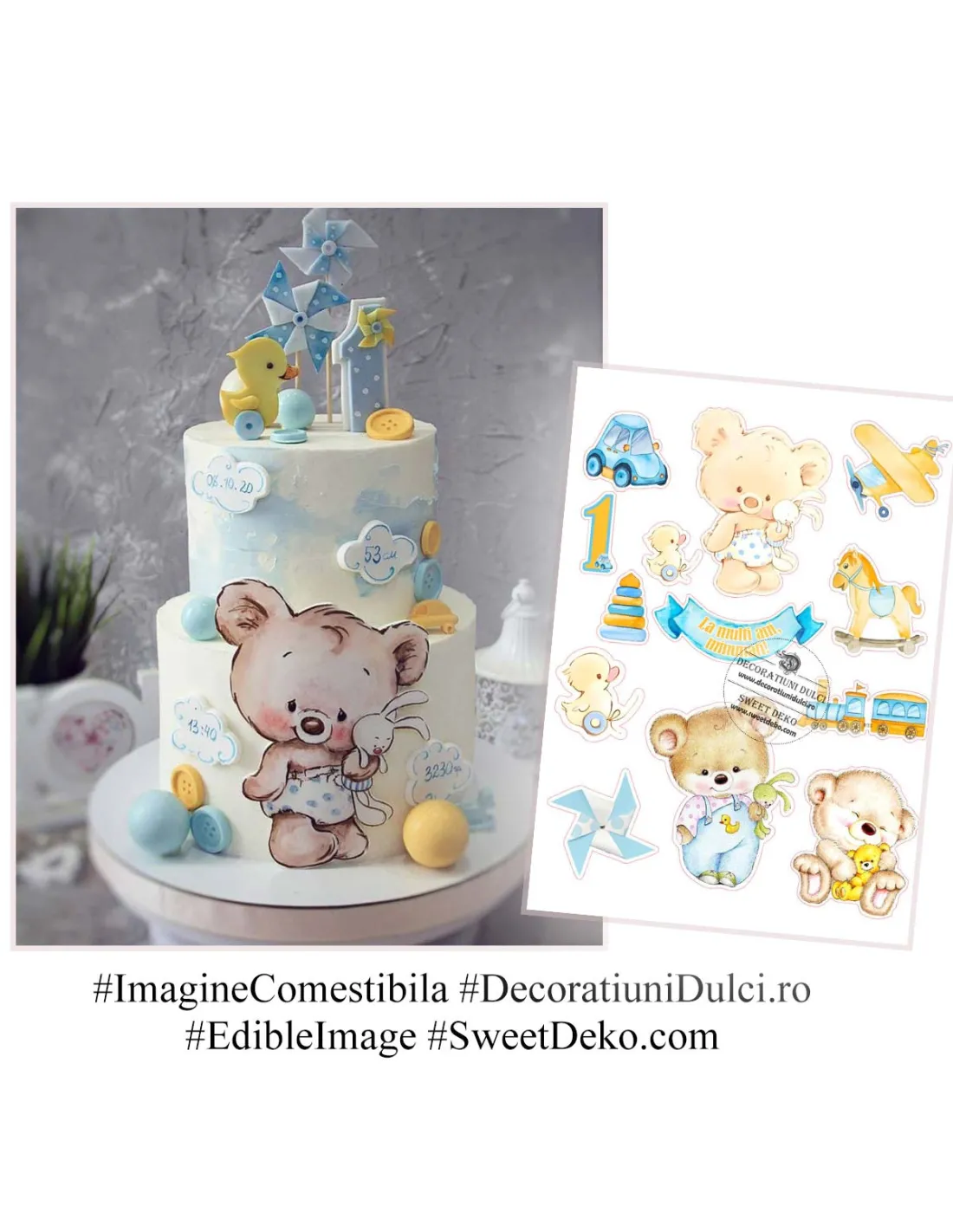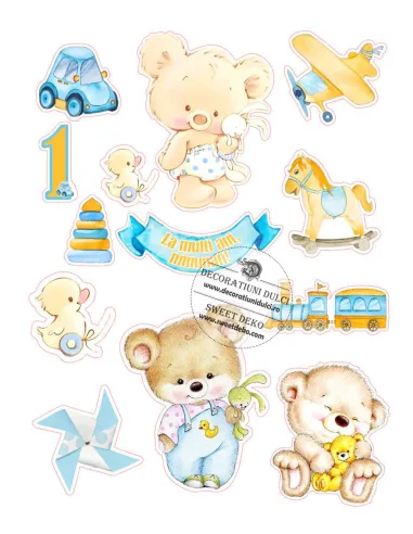 Se potriveste perfect pentru venirea pe lume a unui baietel, botez, prima luna de viata sau primul an. Realizata pe foaie comestibila premium, cu cerneala alimentara certificata, se aplica usor pe torturi cu crema, pasta de zahar sau glazura.