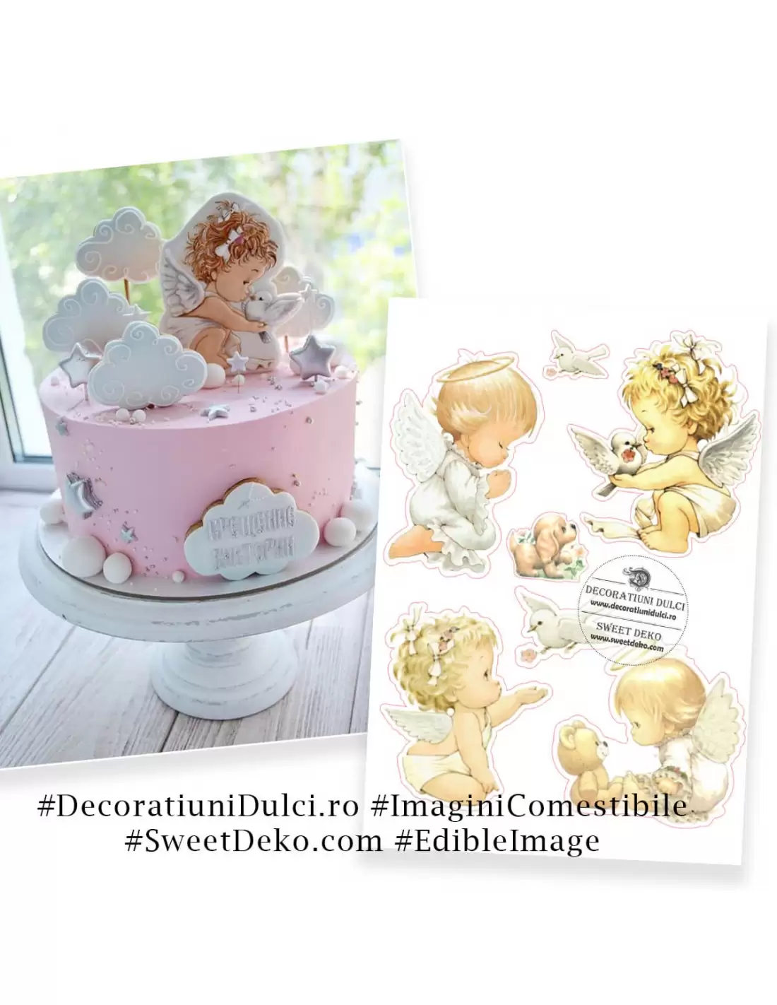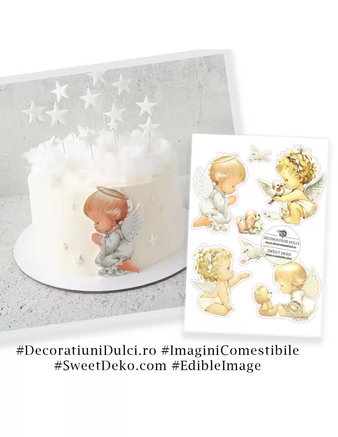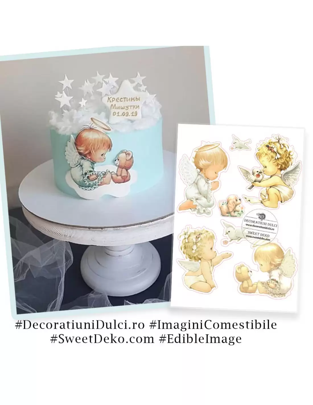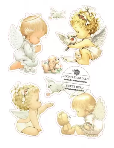 Imagine comestibila | Cei 4 ingerasi sunt poze imprimate pe coala din amidon. Acesta este cu putin mai groasa decat o coala normala si poate fi asezata pe orice material de acoperit torturi: fondant, martipan, frisca vegetala, crema de unt. Se lipeste cu putin lipici alimentar, miere sau royal icing.