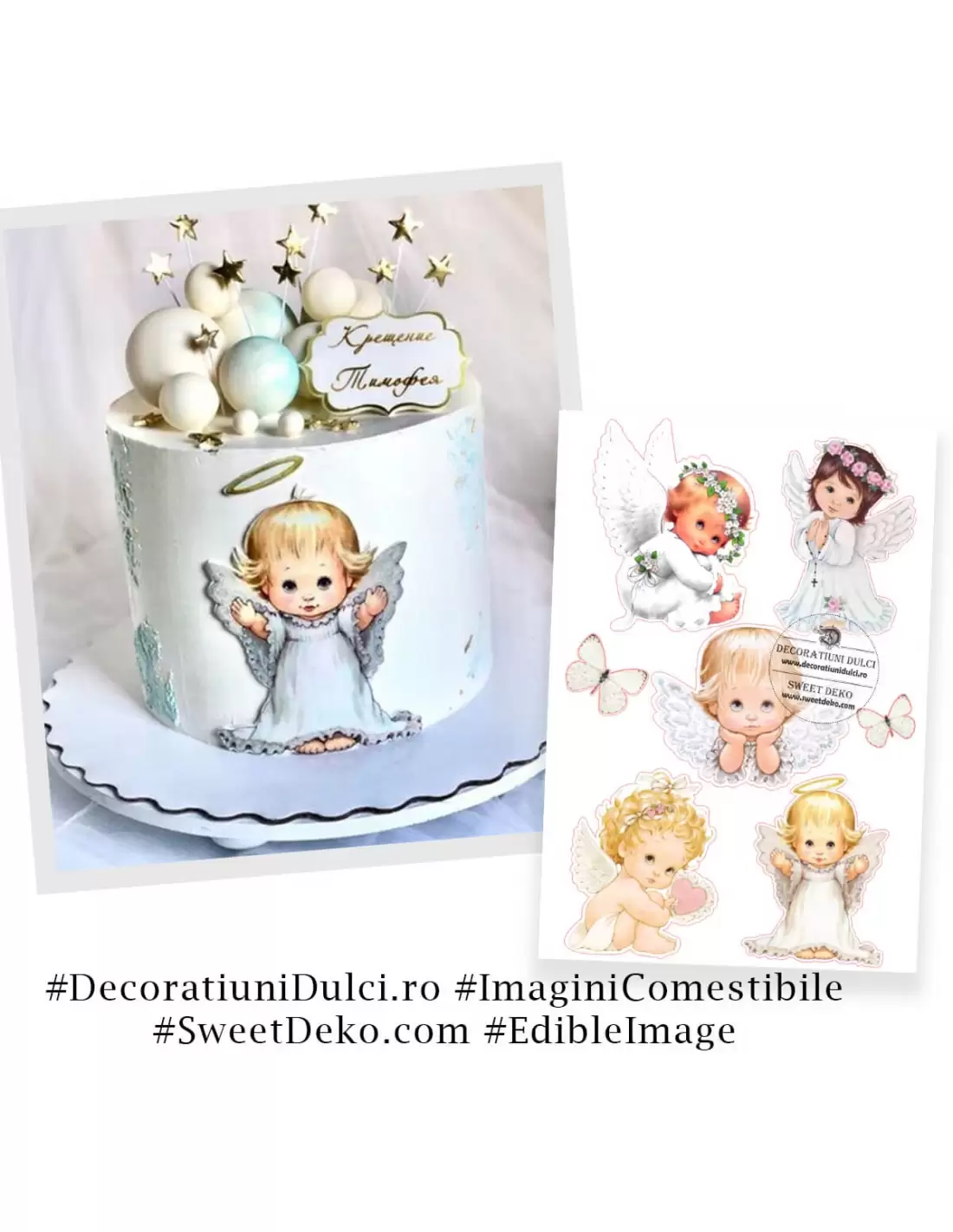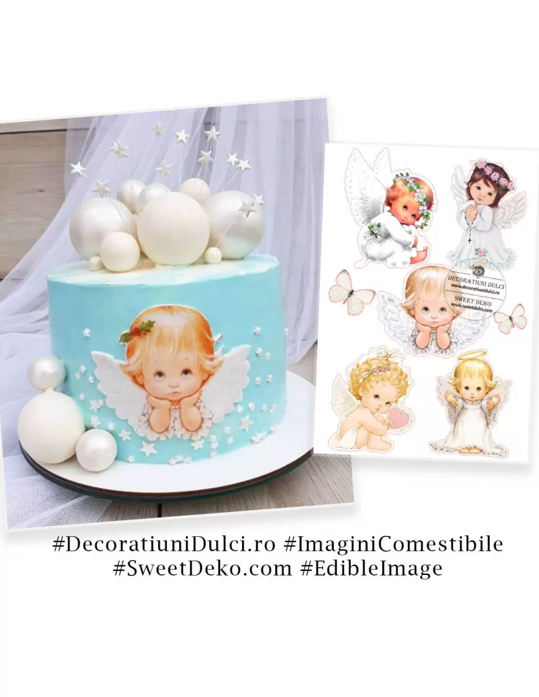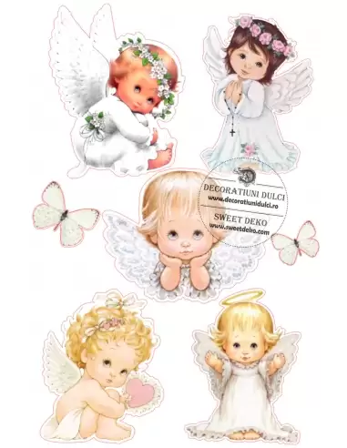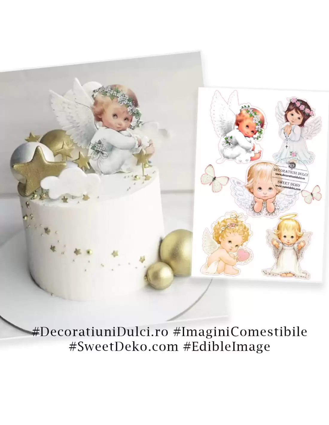 Imagine comestibila |Cinci ingerasi draguti sunt poze imprimate pe coala din amidon. Acesta este cu putin mai groasa decat o coala normala si poate fi asezata pe orice material de acoperit torturi: fondant, martipan, frisca vegetala, crema de unt. Se lipeste cu putin lipici alimentar, miere sau royal icing.