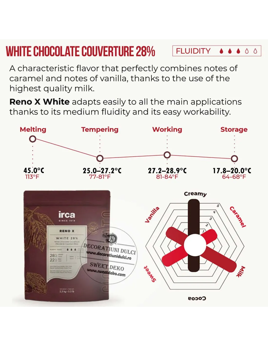 Reno X Bianco 28% este o ciocolata alba profesionala, cu o aroma intensa de lapte si note fine de caramel si vanilie.