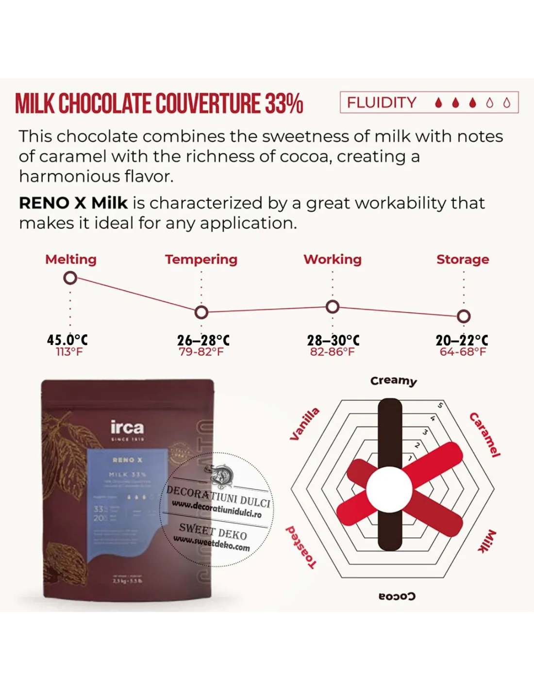Reno X Latte 33% este o ciocolata cu lapte profesionala, cu o dulceata placuta si note fine de caramel si cacao bogata.