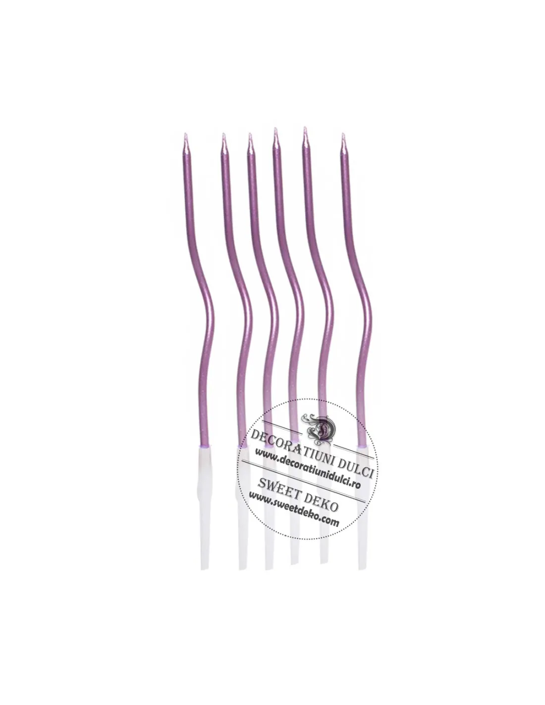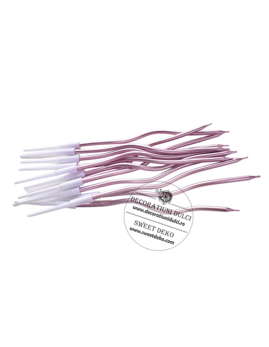 Lumari spiralate roz metalizat (12buc/set) vor da o nota eleganta deserturilor, prin lungimea si forma aparte. Setul contine 12 lumanari lungi (cca.15cm) si suporturi din plastic pentru fixare.