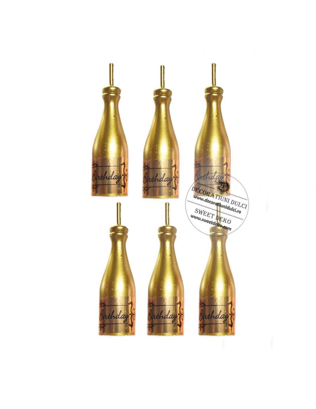 Lumanari mici sticle de sampanie aurie cu etichete pe care este scris mesajul Happy birthday. Aceste lumanari tridimensionala sunt potrivite atat pentru briose cat si pentru tortulete bento cake.