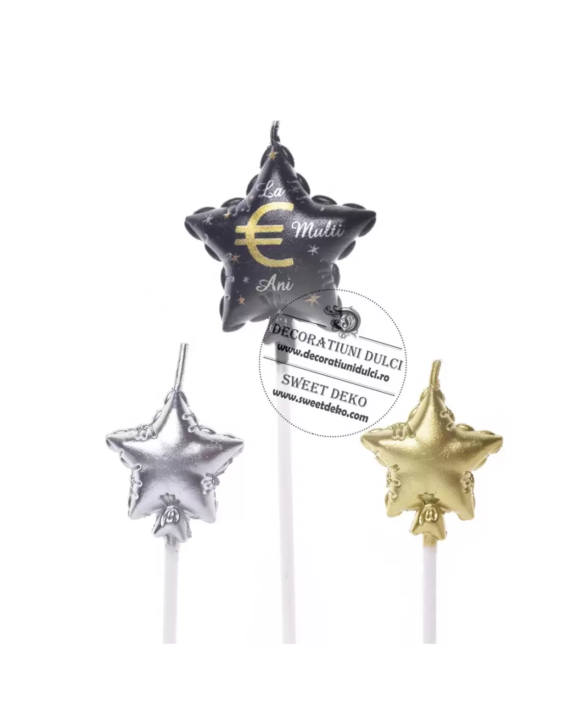 Set 3 lumanari in forma de balon stea. Cea mai mare are mesajul La multi ani! si semnul € un set hazliu care va poate completa decorul torturilor cu bani comestibili.