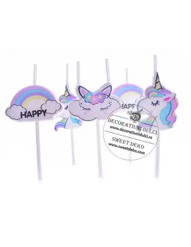 Unicorn si norisori, set 5 lumanari mici cu culori pastel si mesaje pe norisori care exprima bucurie.
