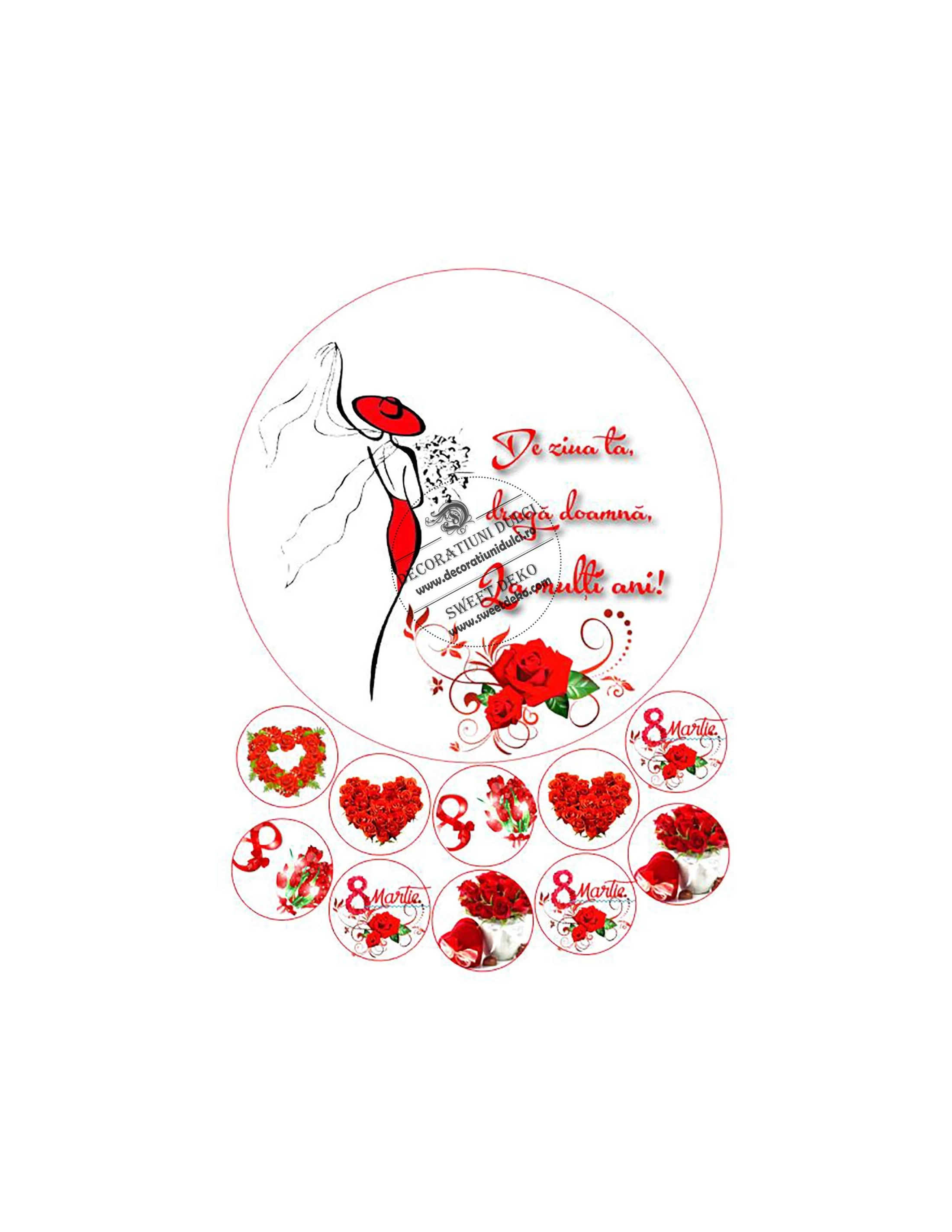 Imagini imprimate pe coala din pasta de zahar, pentru decorarea torturilor care sarbatoresc femeia. Fa o declaratie dulce, de ziua femeii. Imaginile pot fi asezate pe orice material de acoperit torturi: fondant, martipan, frisca vegetala, crema de unt. Se lipeste, pe pasta de zahar, cu putin lipici alimentar, miere sau royal icing.