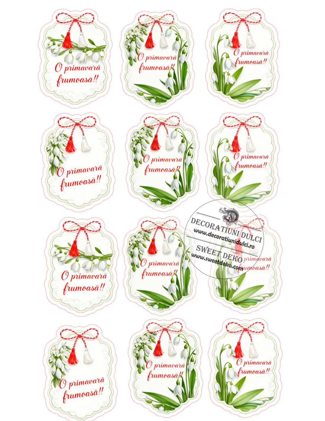 Imagine comestibilă Martisoare cu ghiocei – suntmici etichete cu mesajul "O primavara frumoasa!!", perfecte pentru decorarea deserturilor și oferirea unui strop de magie de Mărțișor!