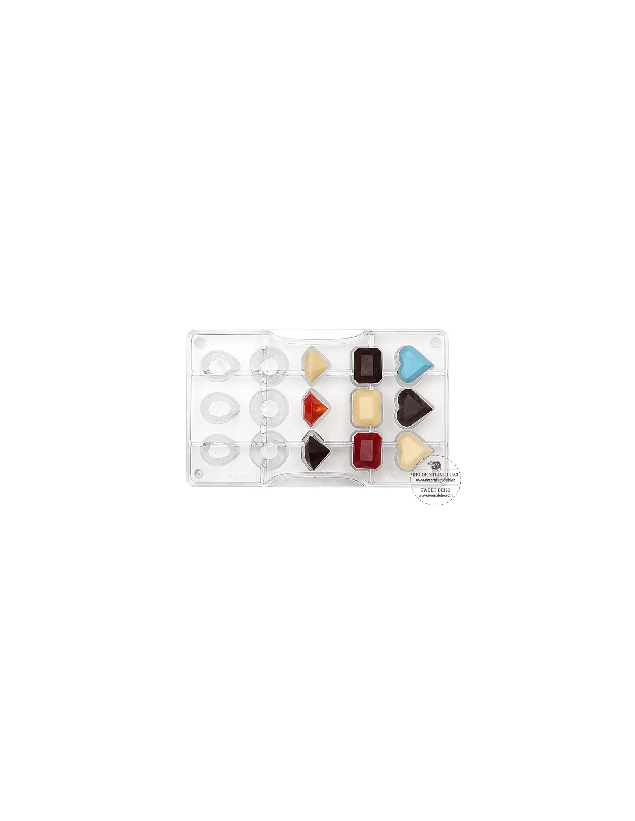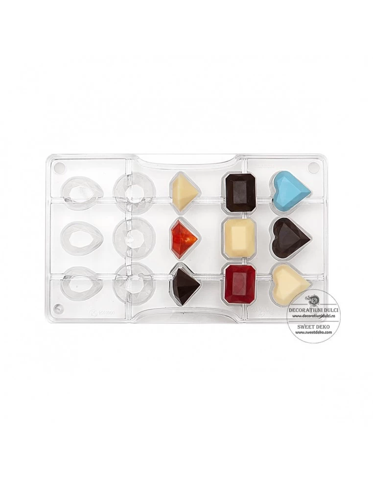 Matrita din policarbonat profesionala, cu 15 cavitati pentru realizarea bomboanelor din ciocolata. Policarbonatul este un material care va permite sa obtineti bomboane de ciocolata stralucitoare si perfecte. Bomboane de ciocolata cu forme inedite, pe care le puteti oferi ca atare sau pe care le poti adauga in decorul torturilor, brioselor etc. Tematica cu piratii, comori, coroane, regine si printese, glamour, fashion poate fi imbogatita cu aceste bombonele deosebite.