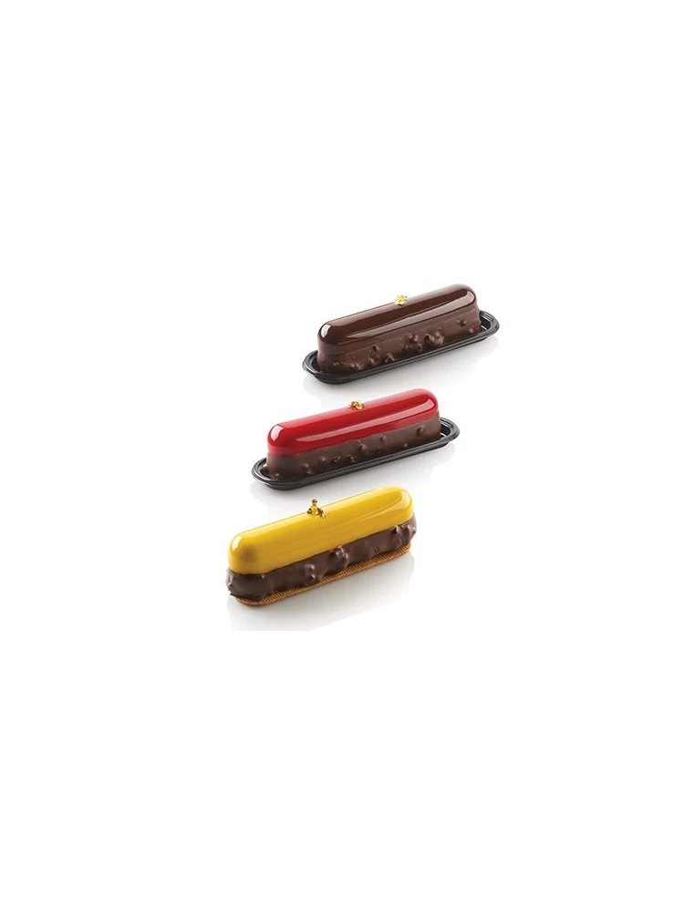 Prajituri cu stil ce vor lumina vitrina cofetariei tale. O matrita clasica, pentru patiserie, revizuită într-o maniera modernă în care creativitatea, prospețimea și estetica se îmbină pentru a crea eclerele perfecte cu L’Éclair120 de la Silikomart Professional. O matriță cu 8 cavități cu 120 ml fiecare pentru a crea compozitia rafinata cu diferite combinații de culori. În fiecare pachet, sunt incluse zece farfurii pentru o prezentare finală perfectă și un tăietor din plastic pentru a realiza inserții și / sau baze originale care se potrivesc perfect cu forma matriței.