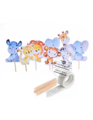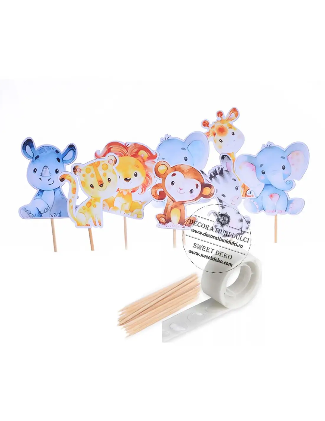 Mini animalute safari, toppers carton fotograic, lucios pentru decorarea deserturilor. Setul contine animalutele imprimate in oglinda, scobitori si bulinute adezive din silicon.