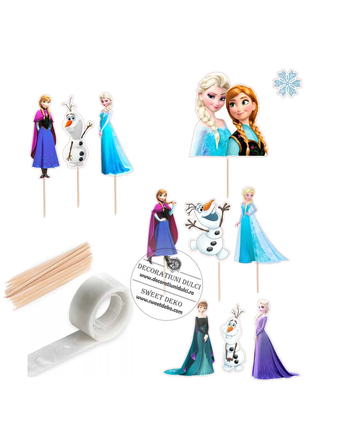 Produsele perfecte pentru decorarea atat a tortuletelor micute cat si pentru briose sau alte mono portii. 20 de mini toppers cu cele trei personaje indragite: Elsa, Ana si Olaf in diferite ipostaze ale povestii. Decorurile sunt realizate din carton fotografic lucios, pe o singura fata. Imaginile sunt fata/verso si le puteti utiliza fie lipite fata/spate sau individual.