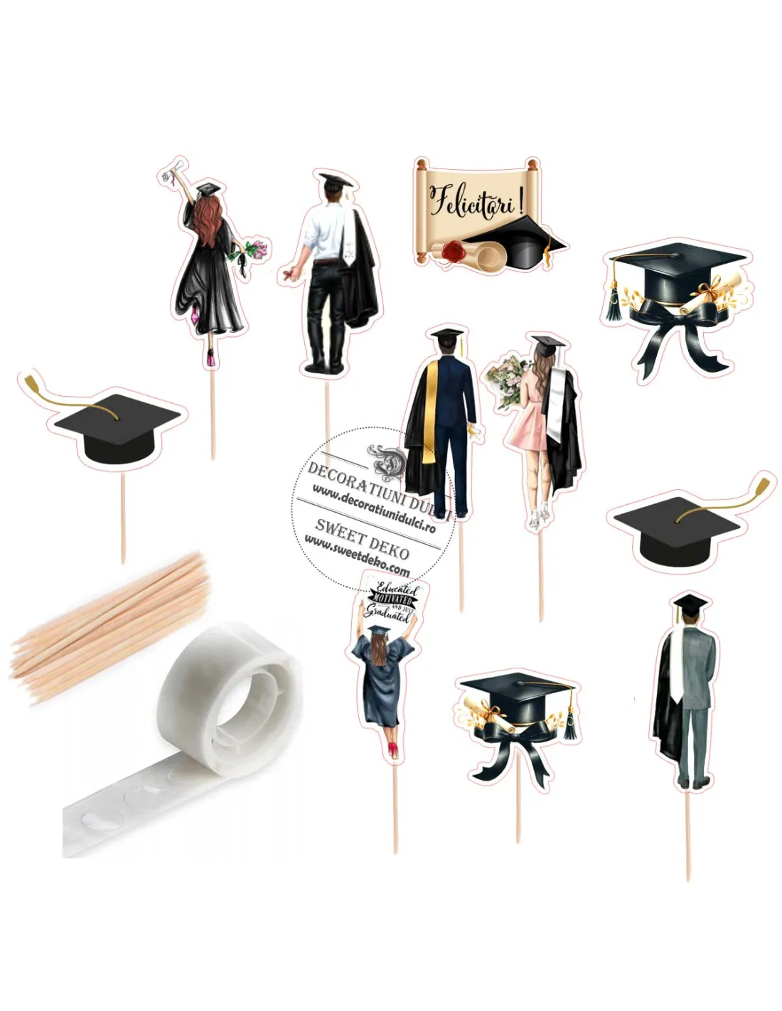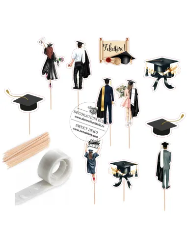 Mini toppers siluete absolventi pentru decorarea tortului sau meselor festive sunt decoruri realizate din carton fotografic lucios, pe o singura fata. Imaginile sunt fata/verso si le puteti utiliza fie lipite fata/spate sau individual.