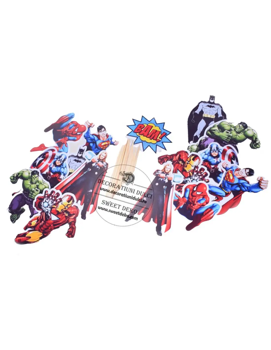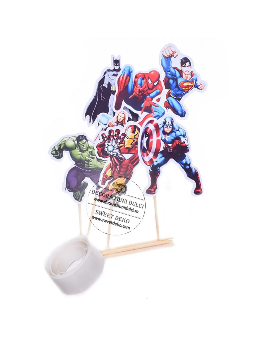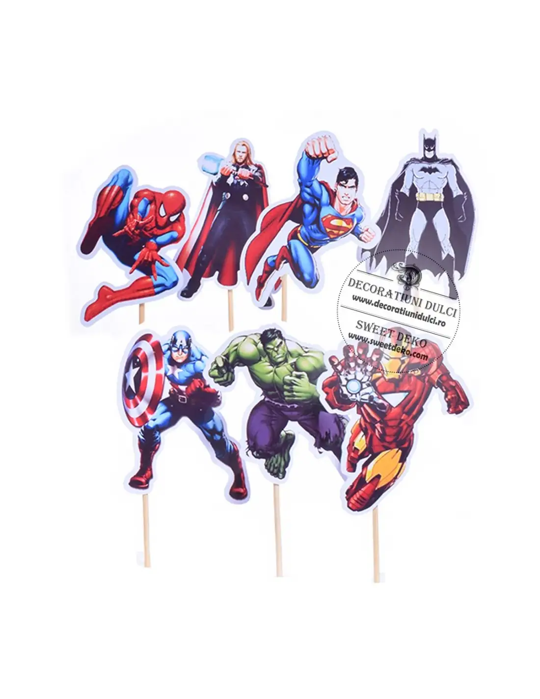 Toppers 7 super eroi realizate din carton lucios, imprimate pe o singura parte decupate electronic. Setul contine 14 figurine cu cei 7 supereroi (imprimate in oglinda), scobitori si bulinute adezive din silicon.