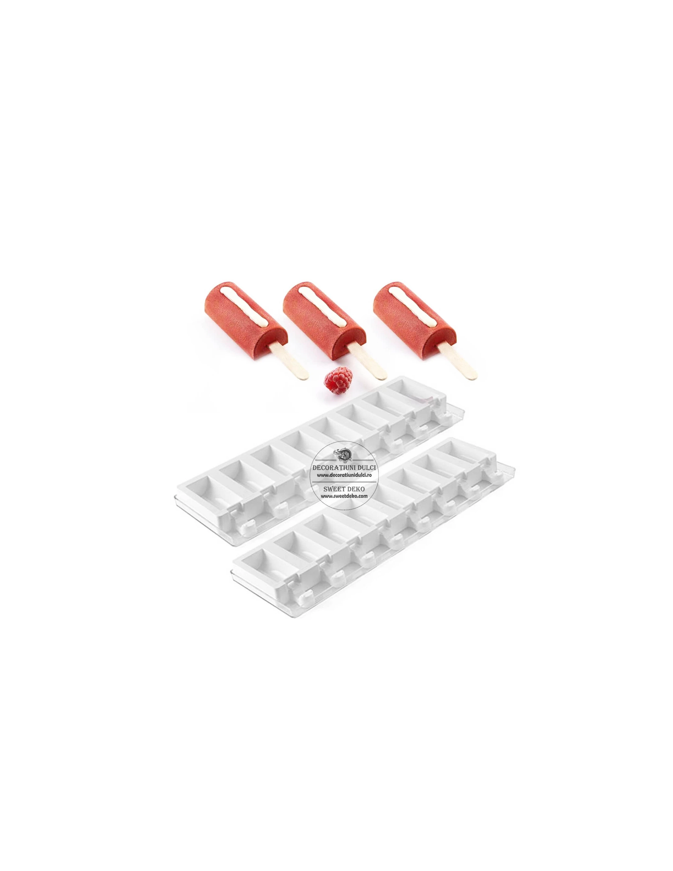 Matrita Cakesicles Mini Chic, GEL05M Silikomart Professional este un chit format din 2 mulaje, 2 tavite din policarbonat si 100 de mini bete din lemn.