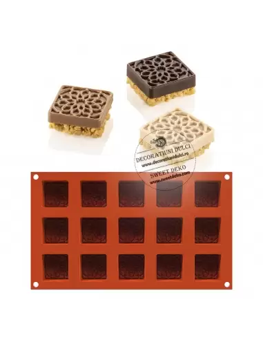 Mulaj monoportii patrate Mauresque, SF379 Silikomart este o forma cu care puteti obtine mici deserturi filigramate. Un design inspirat din cultura araba cu linii armonioase, care se poate utiliza cu ciocolata sau deserturi ce resupune congelarea.